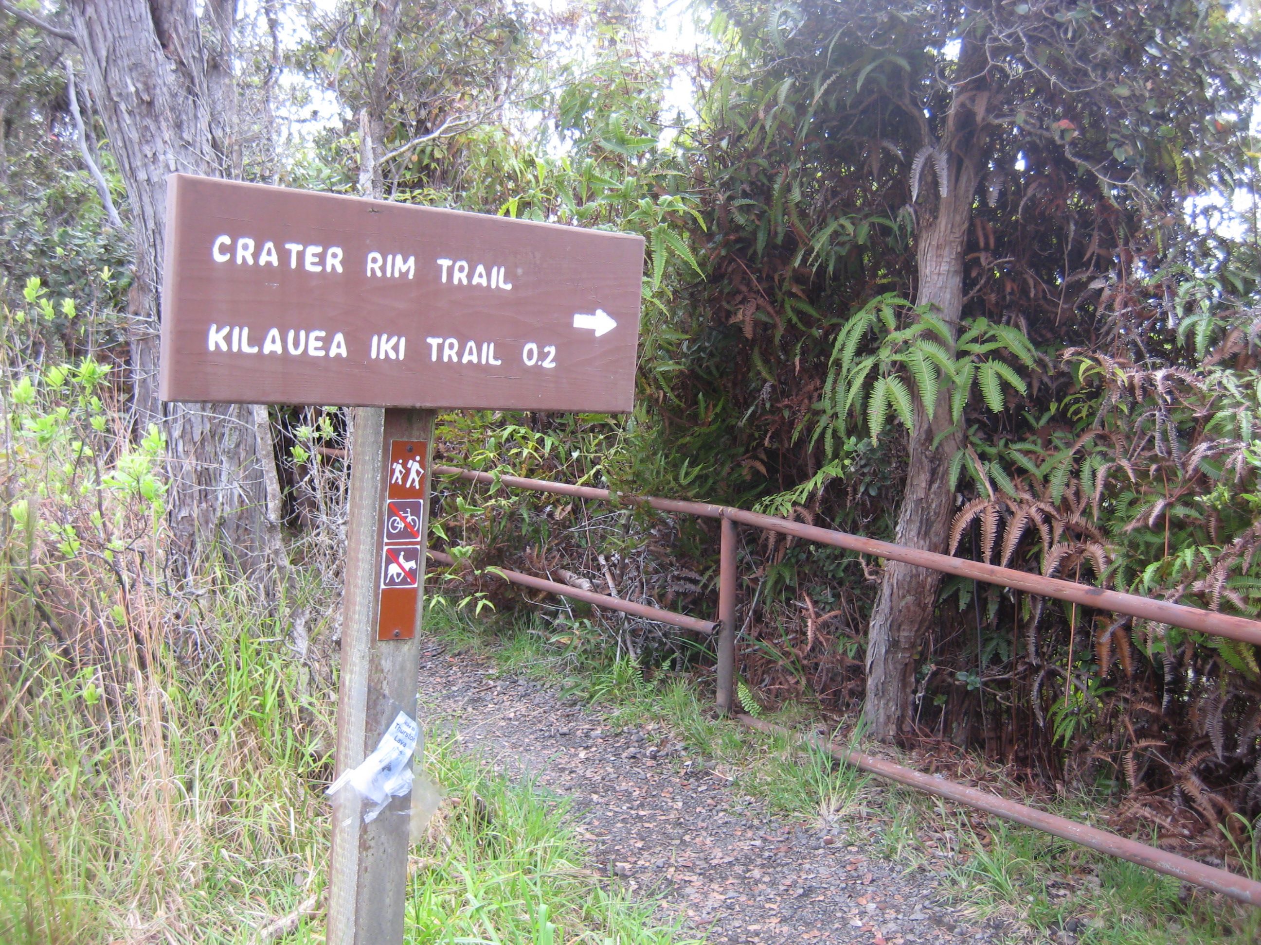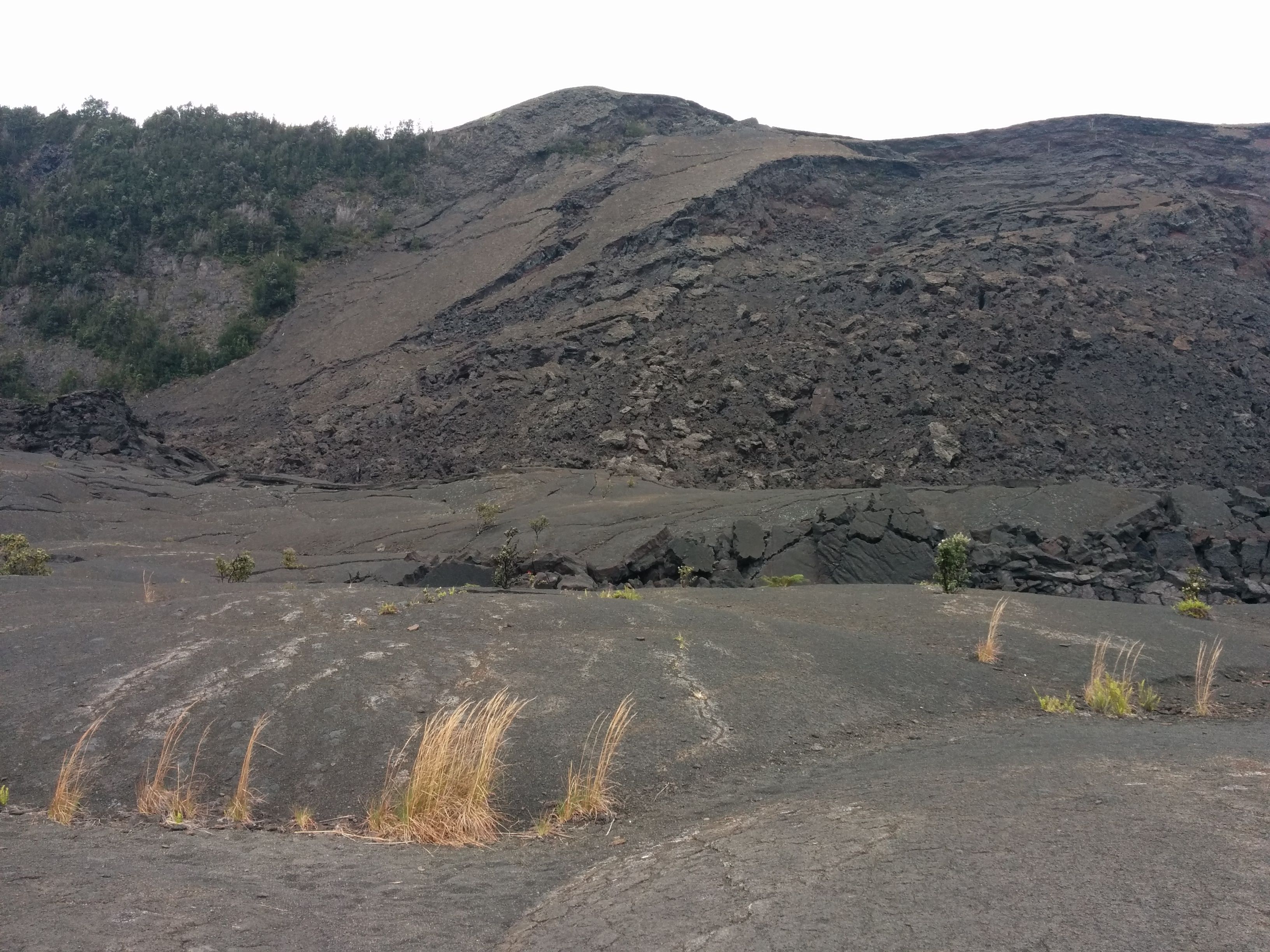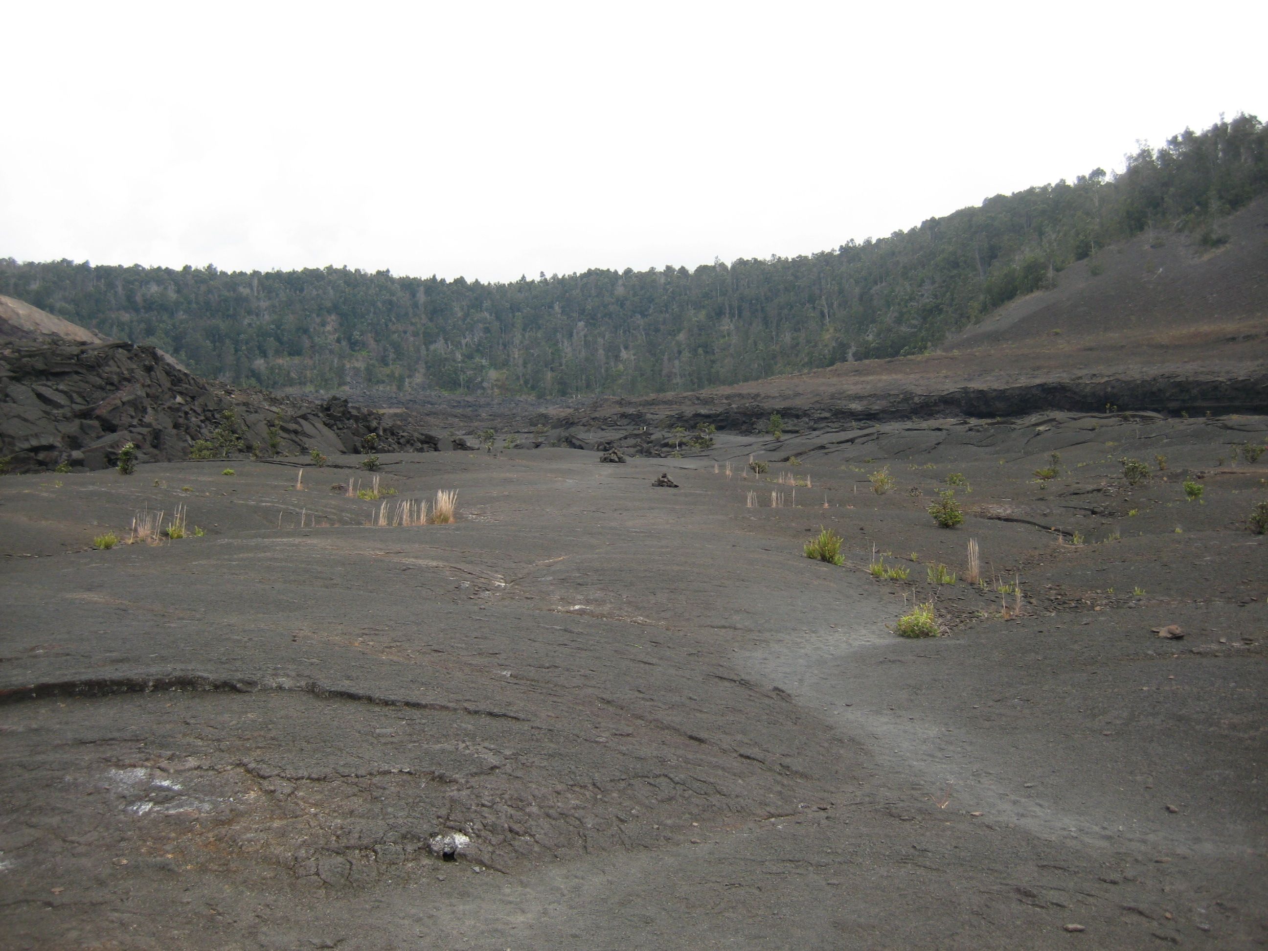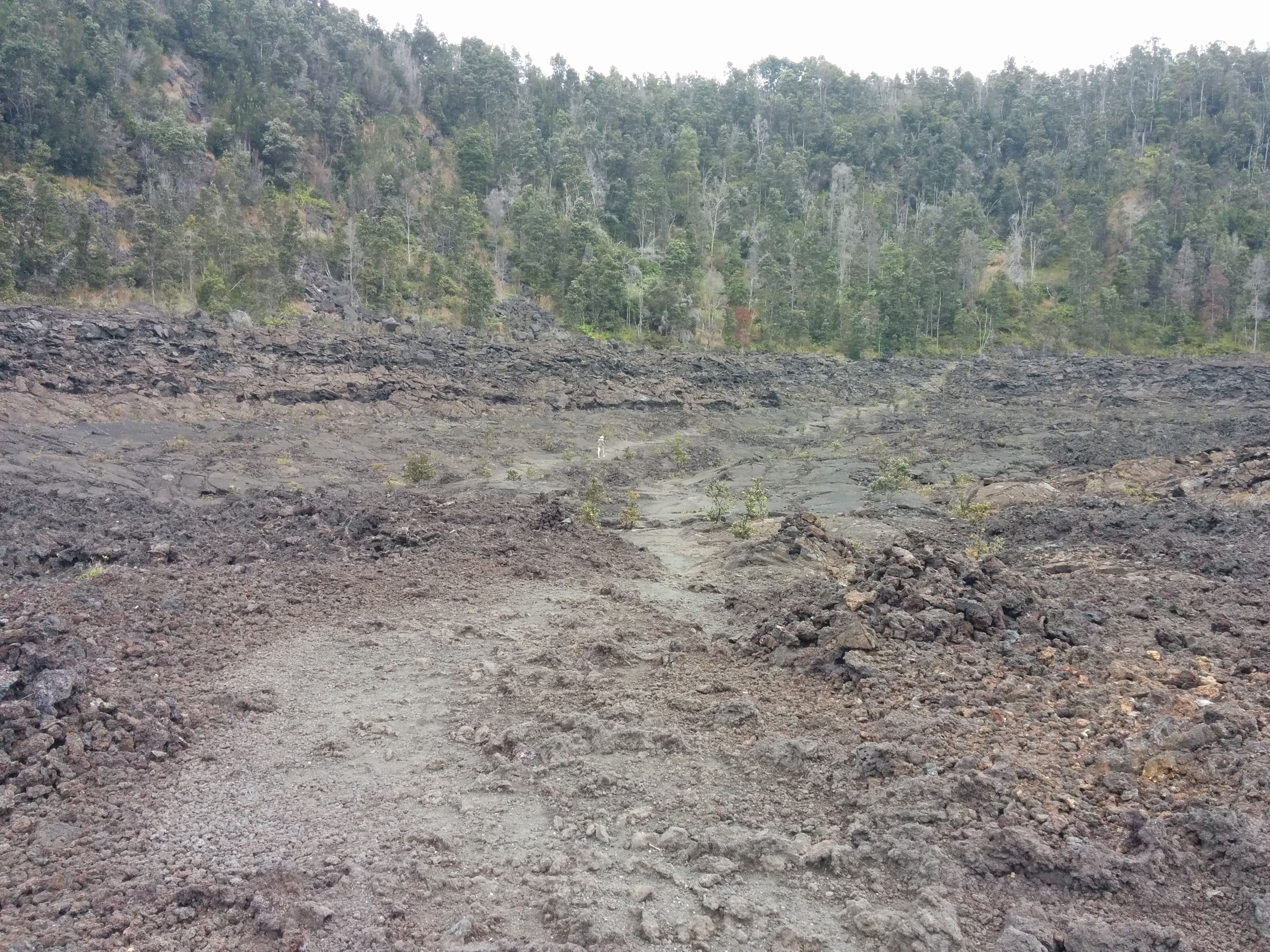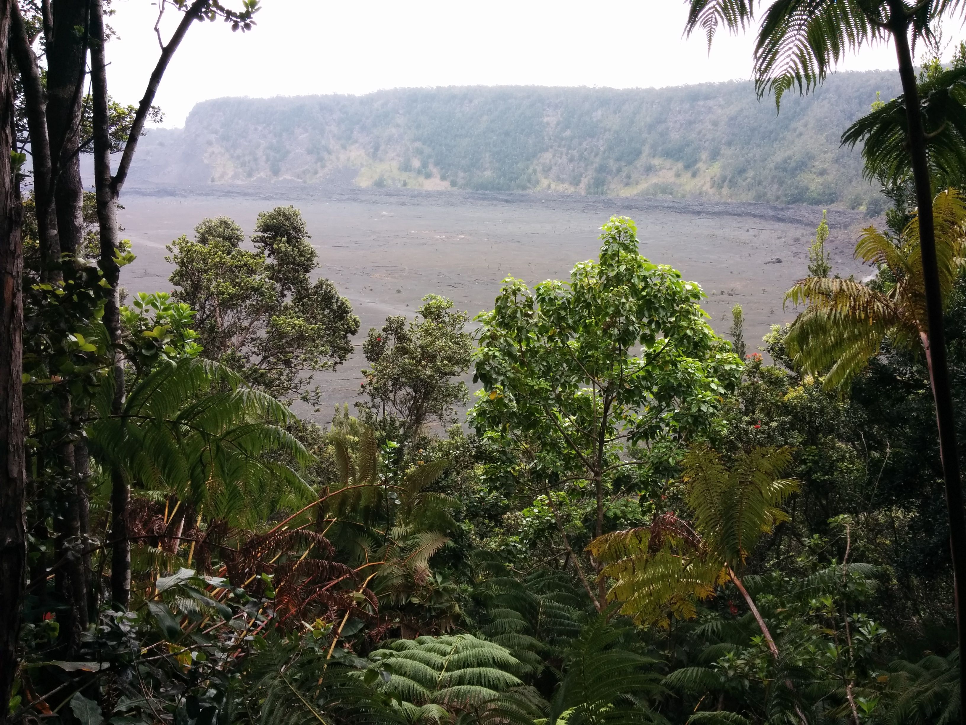 We arrive at the Volcano park and ask the rangerette for hiking recommendations. We do a hike that follows the Crater Rim trail to the Thurston Lava Tube (which we visit - worth it). Then we drop into the Kilawea Iki crater, which is entirely smooth but buckled lava from a flow in 1959. Occasional steam vents.