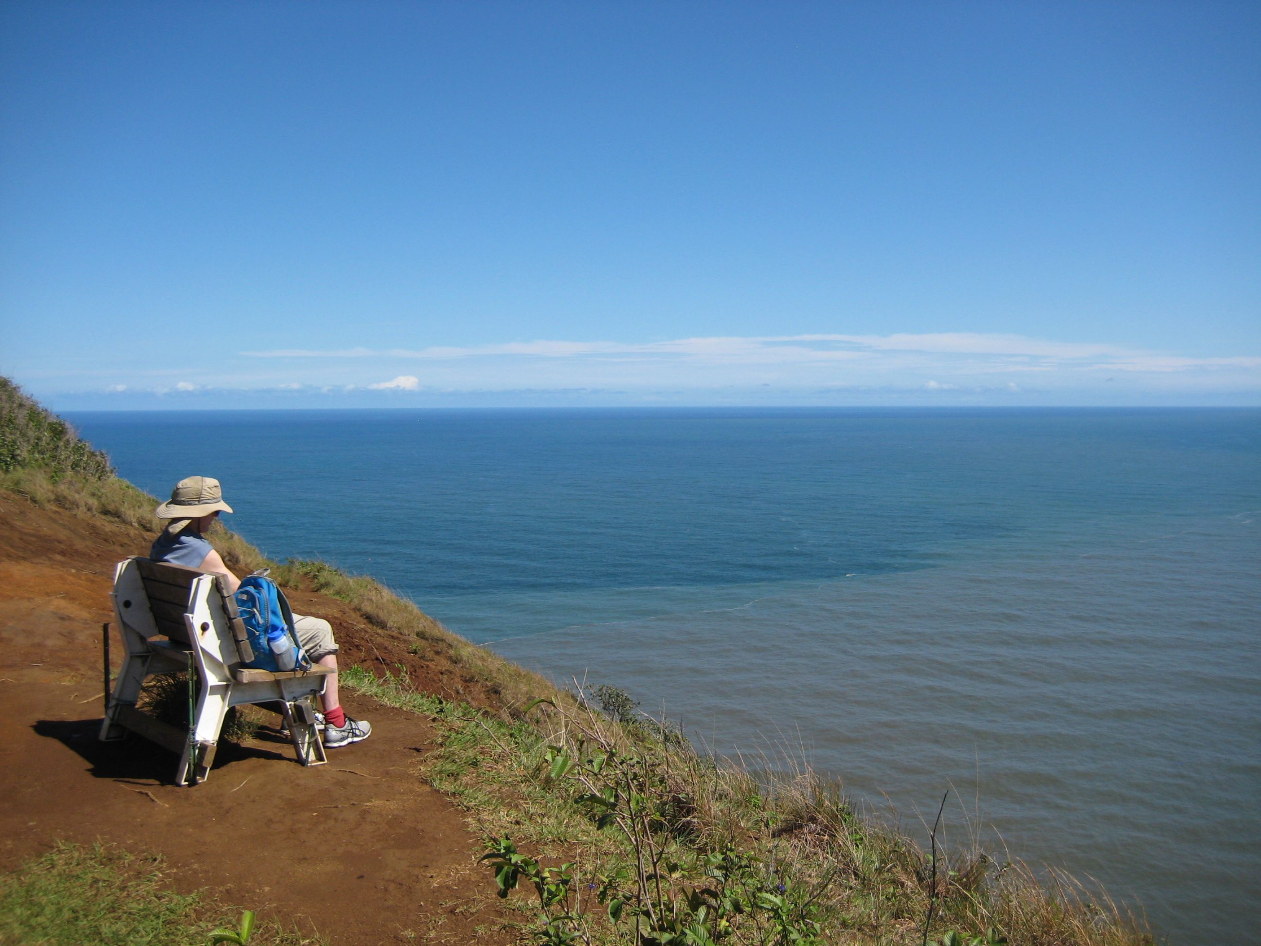 After a mile or so of uphill we reach the edge of the precipice going down into the next valley. There are a couple of benches, and a nice view of the rugged beach.
