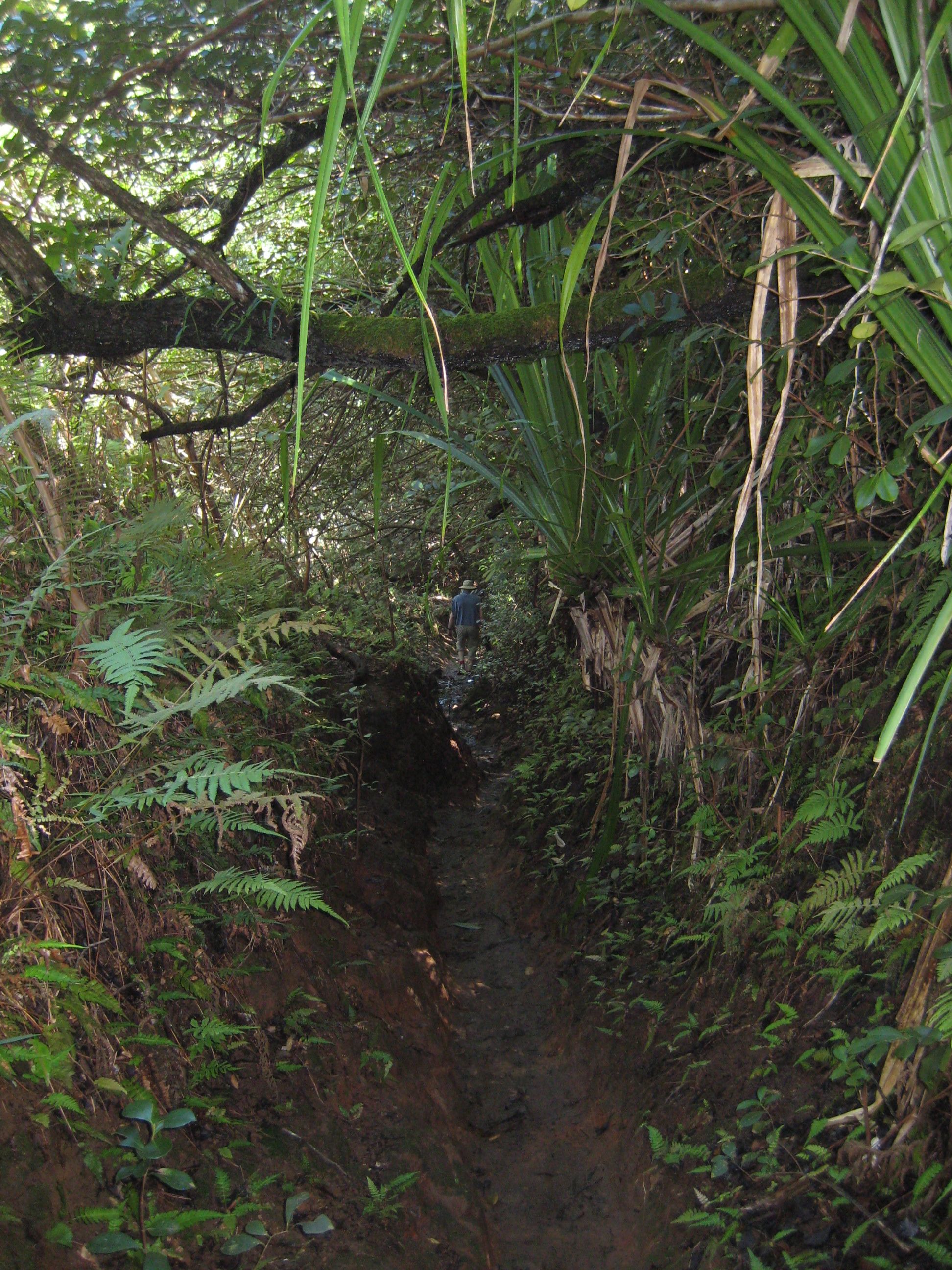 We walk to the end of the beach and find a trail going up the far valley wall. This is a narrow trail through the jungle.