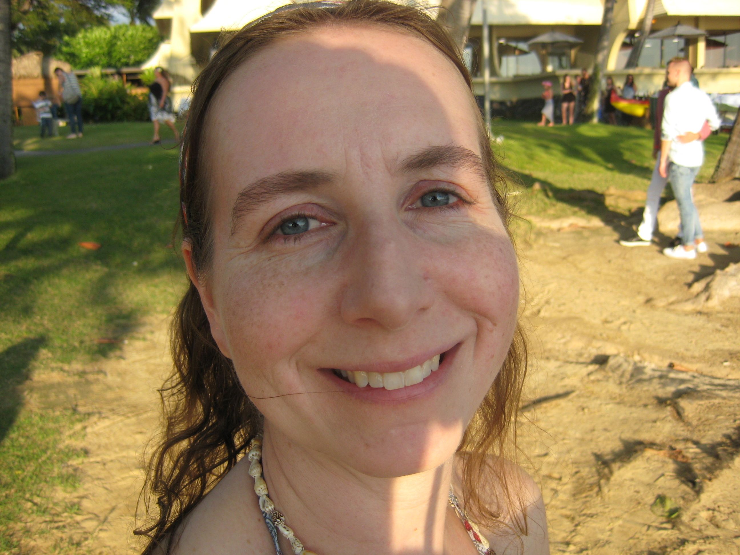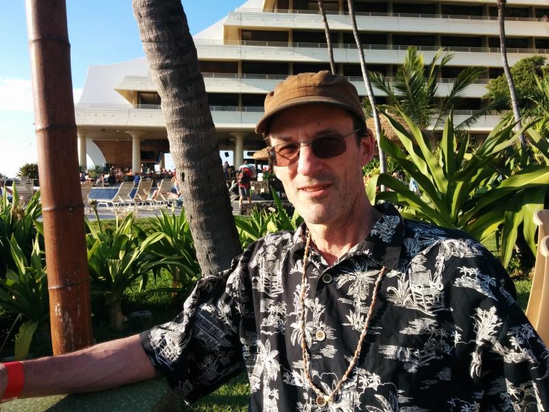 The gathering breaks up slowly. We wander over to the Royal Kona Resort for Y to use the facilities. I chat with a woman, who was at the Luau, with impressive multi-color tattoos on her ample arms. The left arm has an abstract Koi, representing her partly Asian ancestry. The right arm is a salmon, depicted as an interlocking knot of color bands; a sort of Celtic ornament, representing her Irish heritage. I tell her they're beautiful.