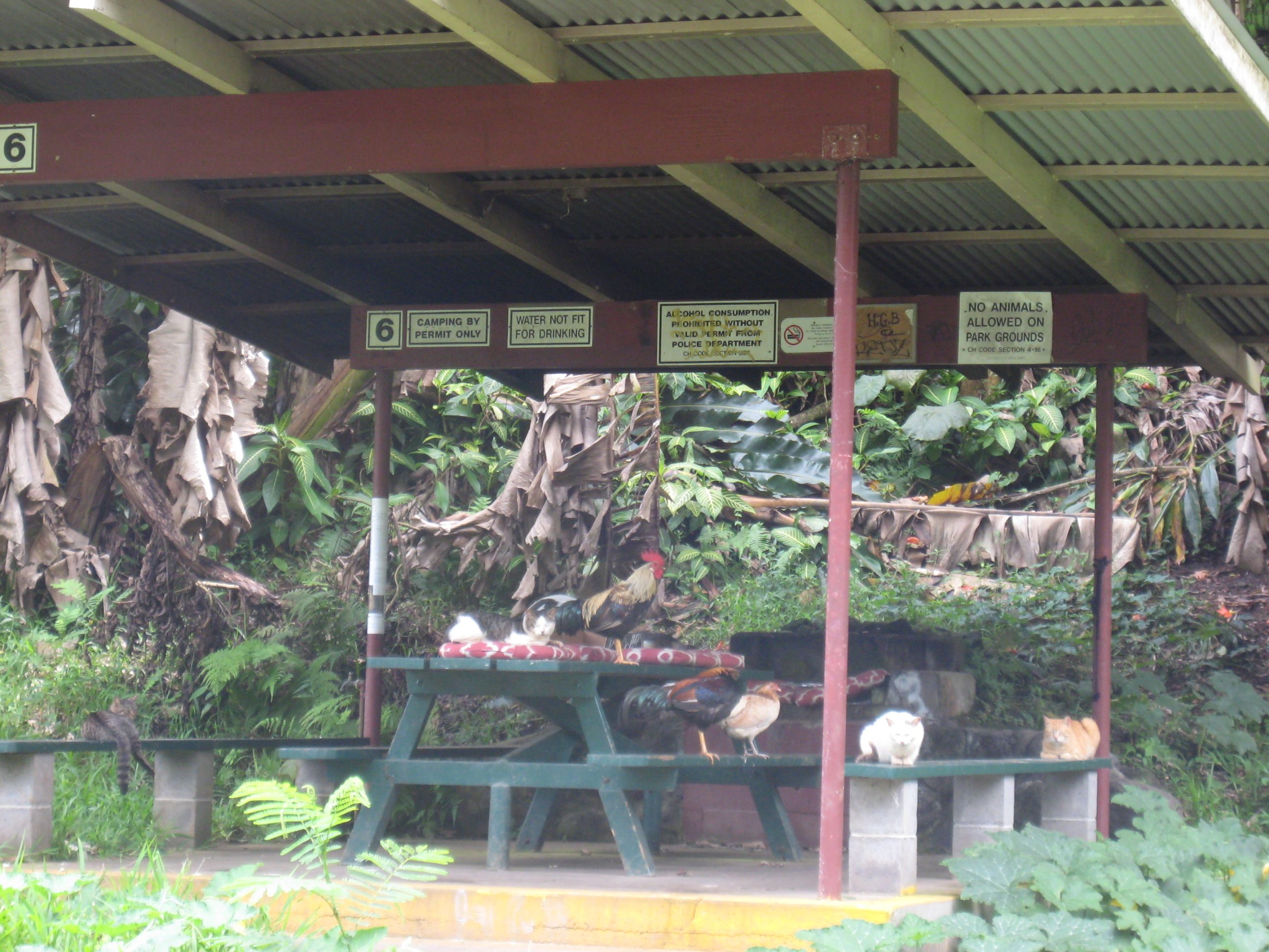 The park is condemned due to lead in the soil, and is in a state of decay. In one of the shelters, a group of feral cats and roosters live together w/ Aloha spirit. The cats sit regally on cushions. Each species is dignified in spite of their reduced circumstances.