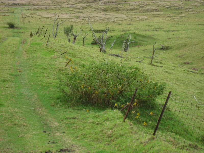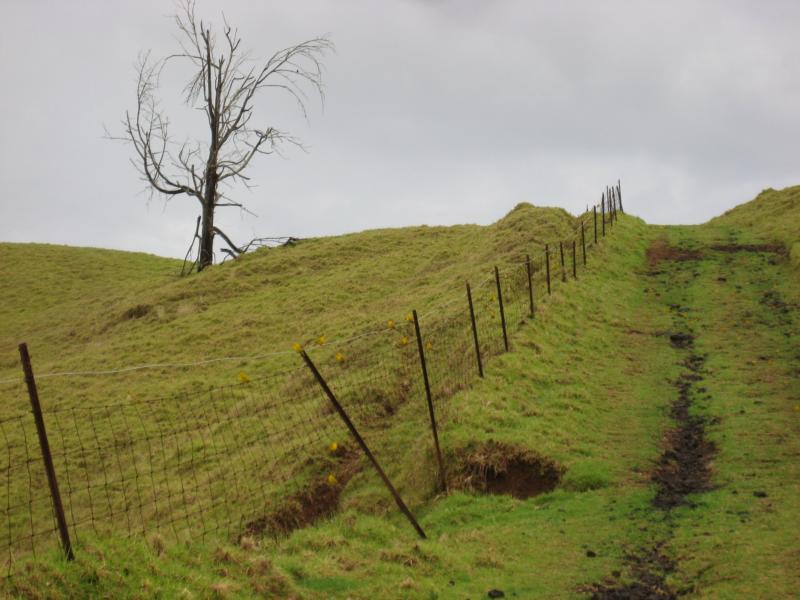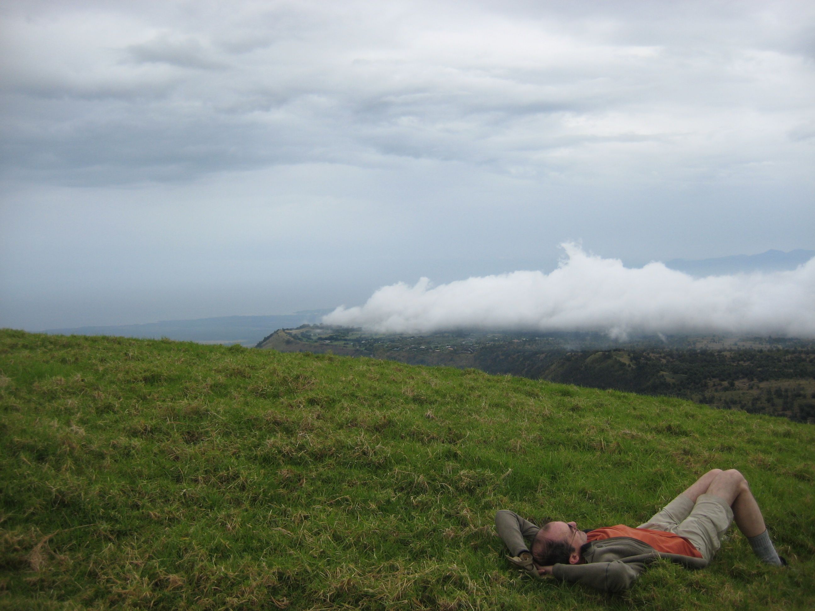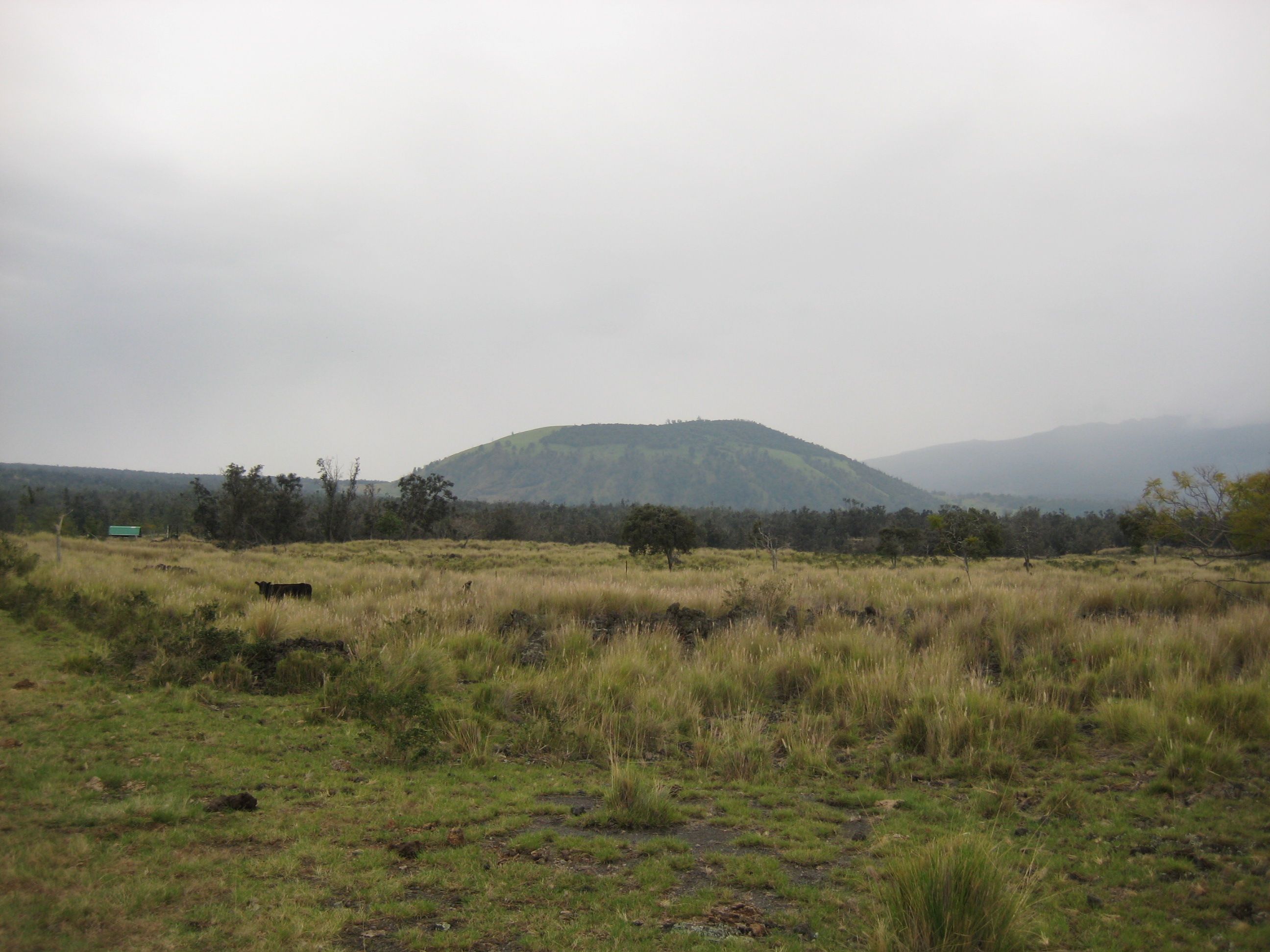 Grim forecasts of rain over the whole island. We elect to take our hosts' advice and do a hike that passes through grazing land and ends up on top of a cinder cone called Pu'u Wa'a wa'a, AKA "Jello Mold" because of its jiggly shape and bright green color.
