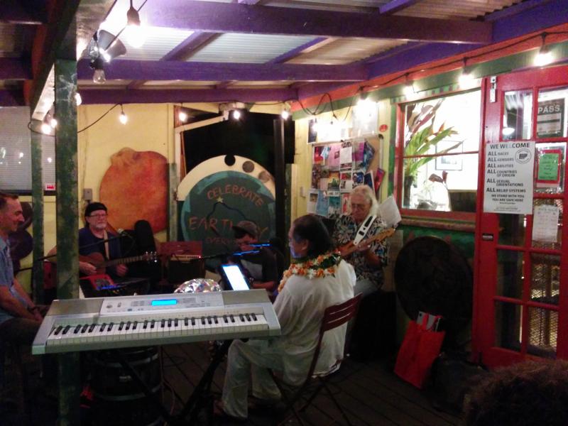 We hear strains of music, and follow them to the "Kava Kafe", a hyper-groovy place that serves Kambucha and various herbal things rather than coffee. A 4-piece band of old guys is playing rock oldies (Stones, Talking Heads) and they're pretty good. A kid with a uke plays along.