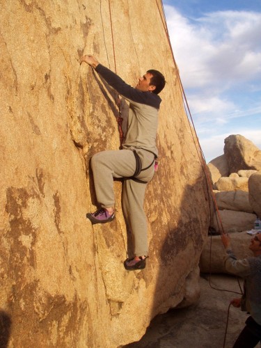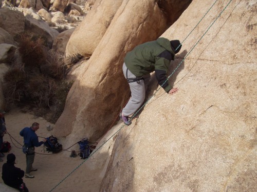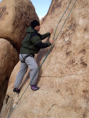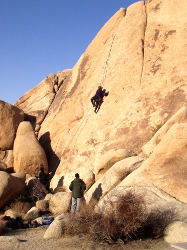 Due to an excess of gear we took 3 cars. We got a late start and decided to stay in the Motel 6 in 29 Palms. The first day had nice weather and we climbed in Echo Cove. That night the weather turned cold and blustery. The second day we went to Headstone but it was too windy to climb it, so we did some top-roping lower down, then went to Indian Cove. We stayed at Motel 6 again. The third day was still windy, so after breakfast at the Country Kitchen in Joshua Tree we returned to Indian Cove, and were joined by Todd's friends Clark and two other guys. Rob, Sasha and I drove back that night. A good time was had by all.