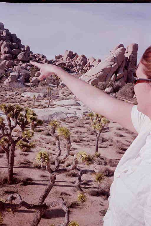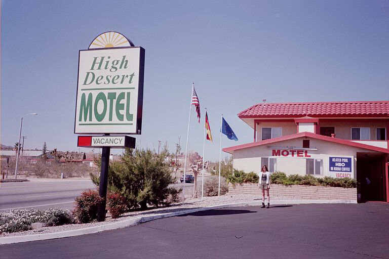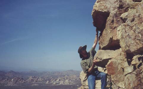 We stopped at a Baker's Square in Palm Springs for dinner, probably the worst meal for which I've ever paid money. Then we drove up highway 62 to the town of Joshua Tree, and the High Desert Motel ($60, OK but rock-hard beds). Next morning we ate at the Country Kitchen, which was packed with other climbers and a wacky guy who wanted to rebuild civilization using the inherently stable triangle.
