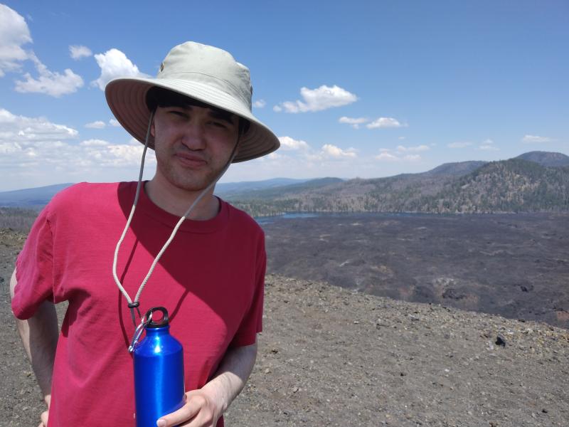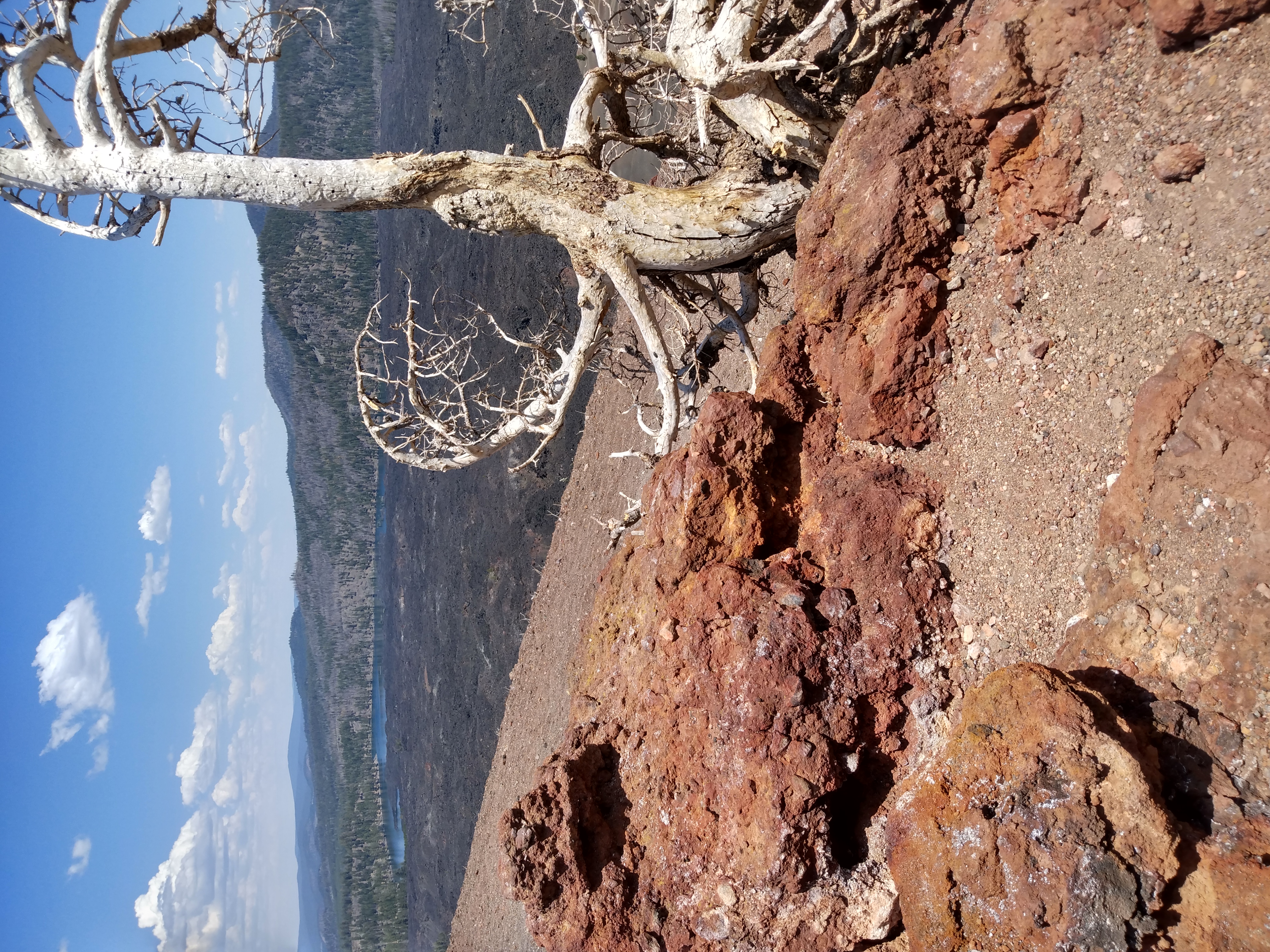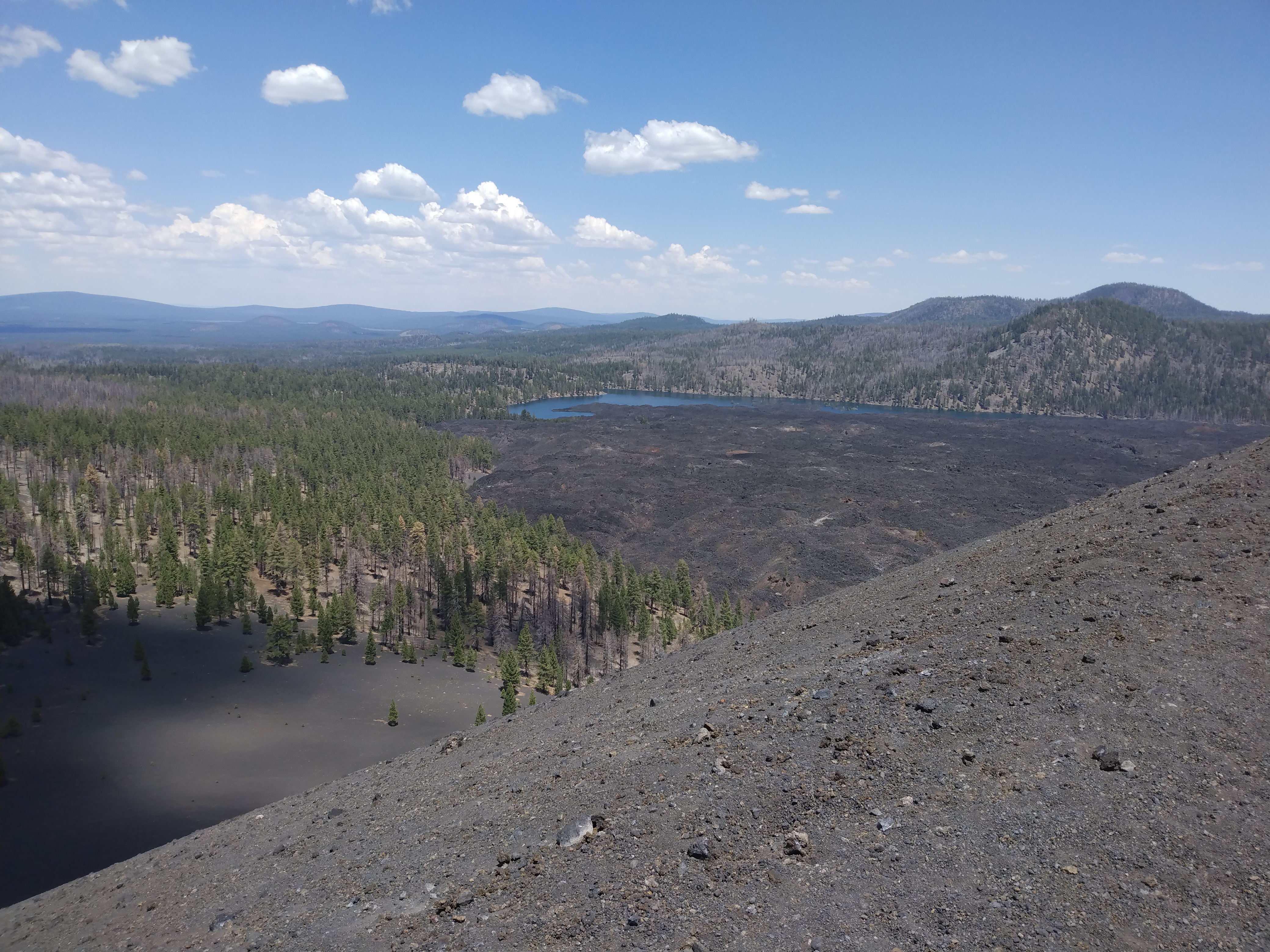 M elects to wait in the shade of some trees at the base of the cone, from which there's a view of the Painted Dunes and of course the Fantastic Lava Beds.