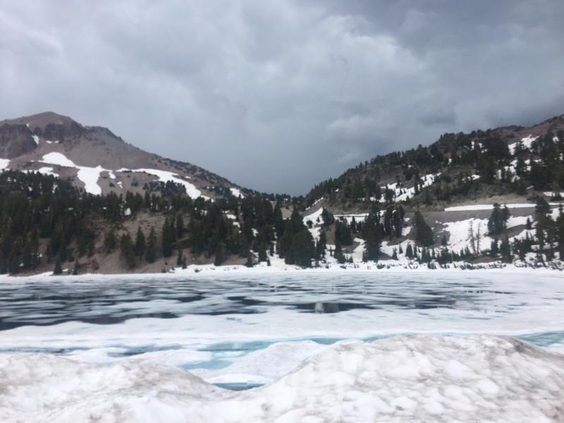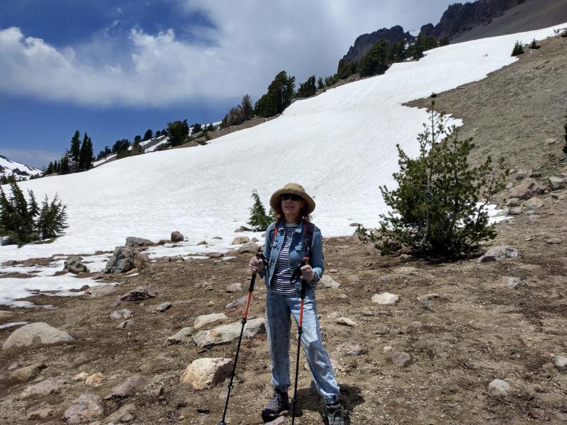 We drive E on 44 like yesterday, but this time we turn S on 89 to enter the park. We drive to the Lassen summit trailhead. The mountain still has big vertical bands of snow, and the parking lot is surrounded by walls of snow.