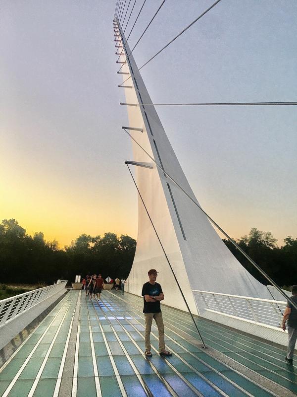 On the way back, I follow the signs for the 'Sundial Bridge'. This is a foot-bridge across the Sacramento River, with a unique suspension design that's kind of like a harp, and a glass walkway that's illuminated from underneath. The suspension tower is illuminated with purple-ish light. Its base is covered with white tile mosaic. At this time of day (post-sunset, fading light) the whole thing is fantastic and beautiful. We cross it and walk around a bit on the other side of the river.