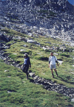 Next morning, playing the role of Evil Drill Sargeant, I roust the troops at 7:30, and we're on the road at 9. After a leisurely stop at the Lee Vining gas station, we reach the Mono Pass trailhead (9,700') at 10:00. We walk on the trail for about 2 miles, then cross a marsh and head for the mountain.