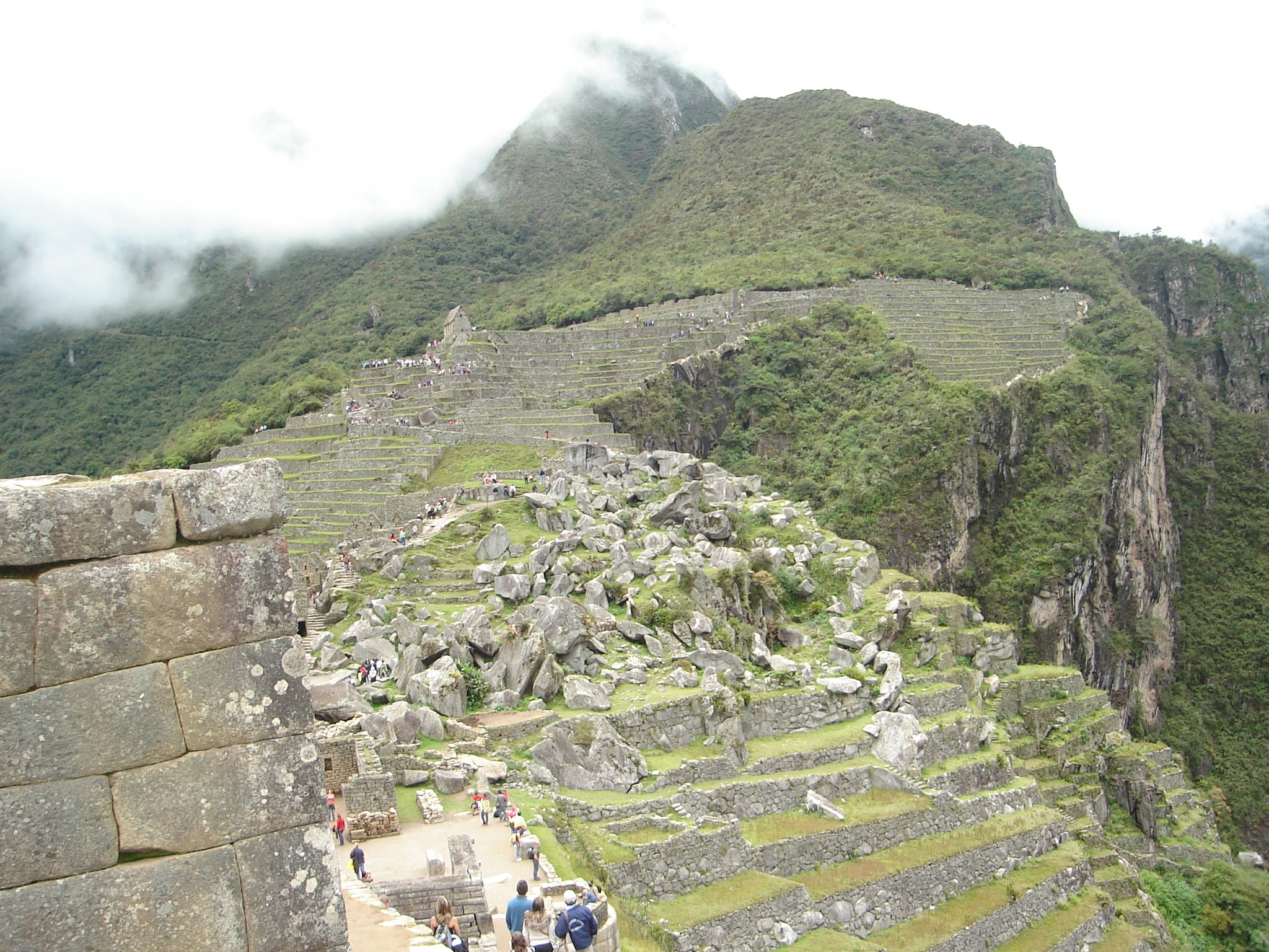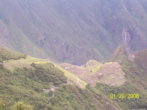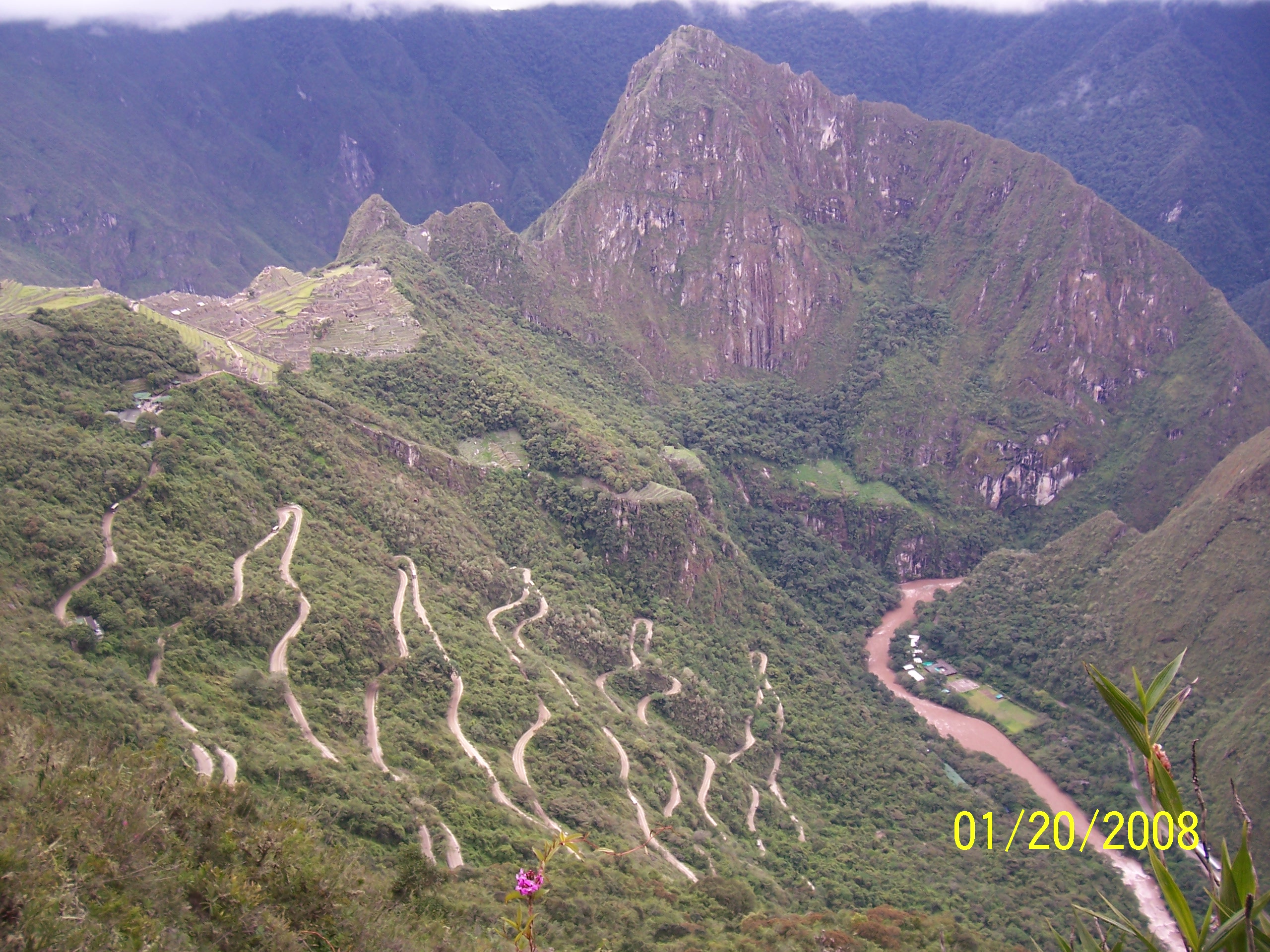 We ride on the train for about an hour to the tiny town of Aguas Calientes, which indeed has hot springs but is mostly a transfer point and a whole lot of tourist restaurants and souvenir stalls. We board a bus, which ascends a steep switchbacked road to Machu Piccho. An intriguing footpath, with stone stairs, goes up more directly.