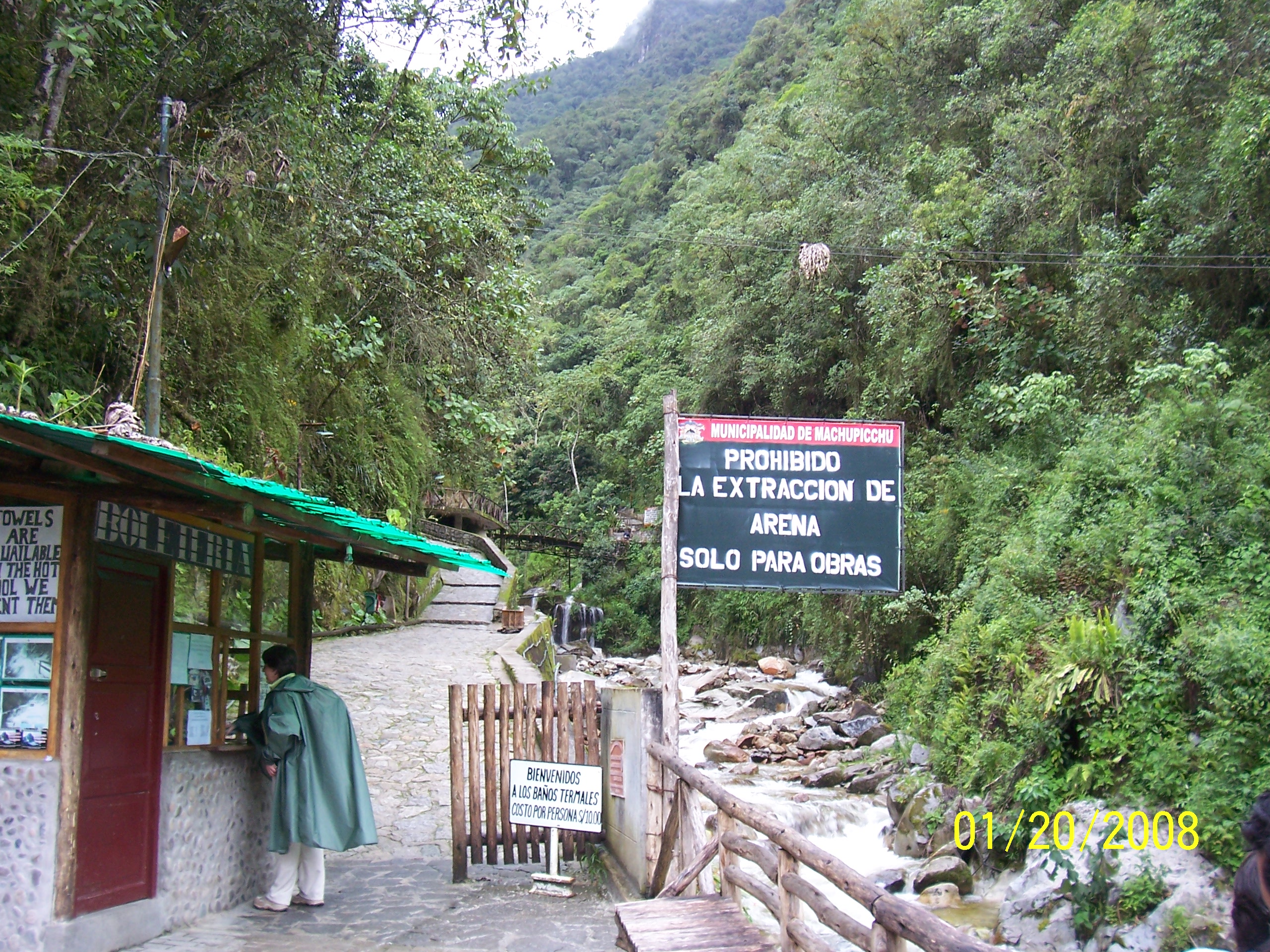 I wander around the tourist shopping area, run into Robin and then Blake, and we walk to the hot springs. Bathing suits are for rent. A sign warns against taking river sand for construction purposes.