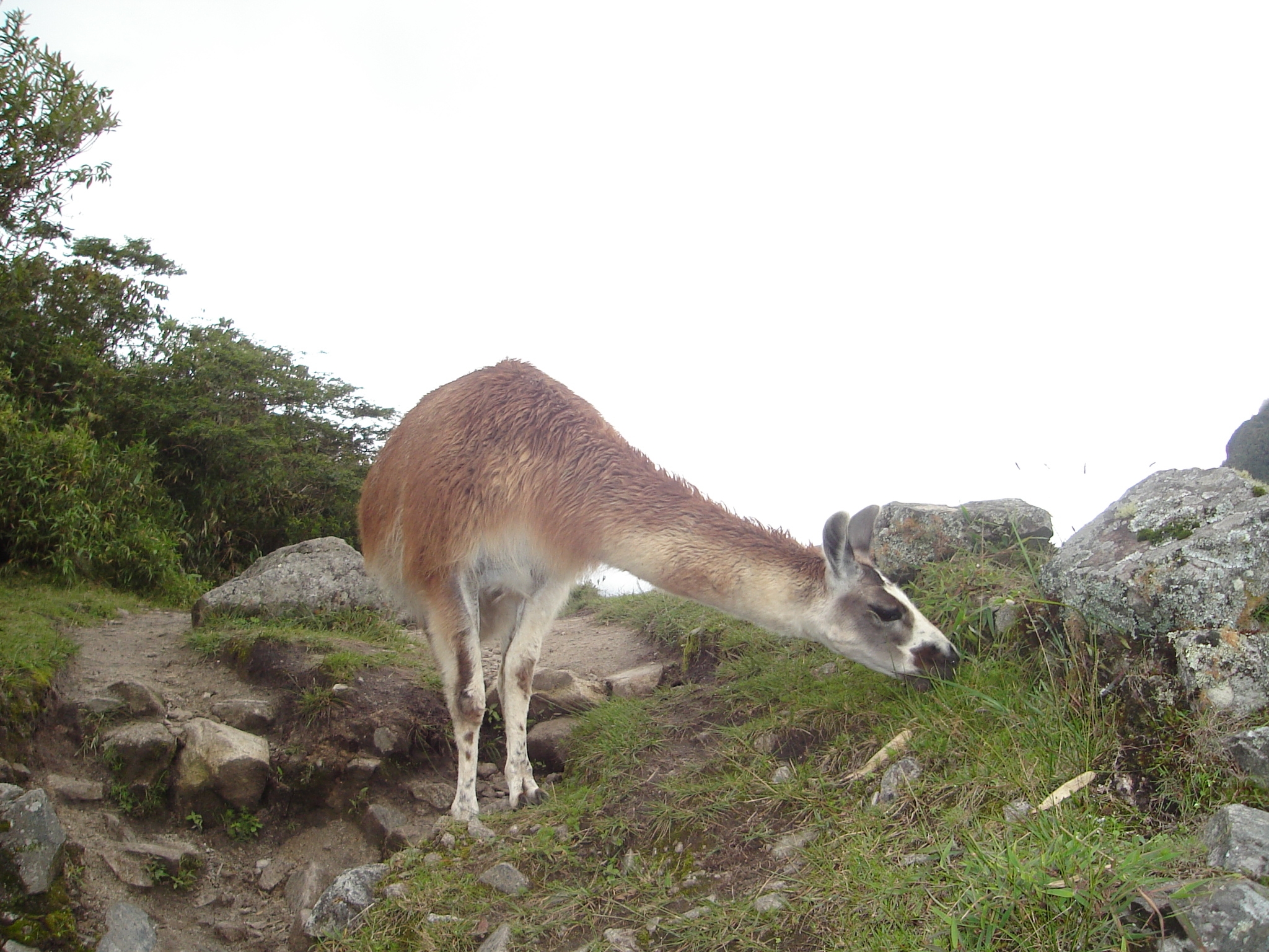 Back at Machu Picchu, there are a few llamas grazing, including a mother and calf. A self-styled comedian tells each passer-by that they're not llamas but Alpacas, and the baby is an Alpacino.