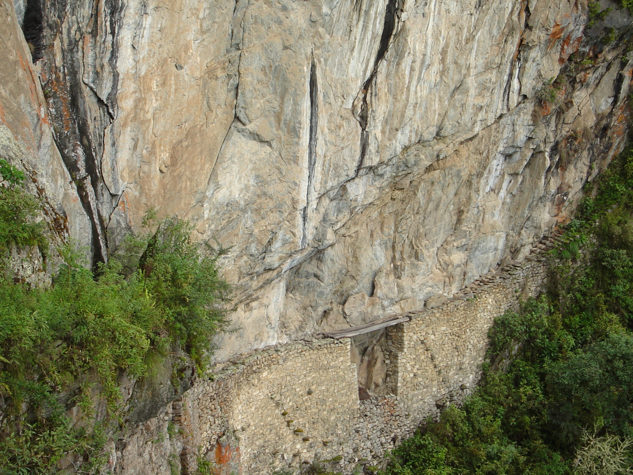 Roughly halfway up the cliff there's a thin horizontal ledge, marked by the plants growing on it. The trail continues along this ledge, but in between there's a 50-feet section of sheer rock. The Incas stacked rocks up from a gully, maybe 50 feet below, to make sort of a synthetic ledge. They left a 15-foot gap in the middle, and laid some timbers across the gap, removable in case of enemy attack; that's the Inca bridge. The whole thing is extremely hazardous, and it's all closed off now (I was not tempted to explore).