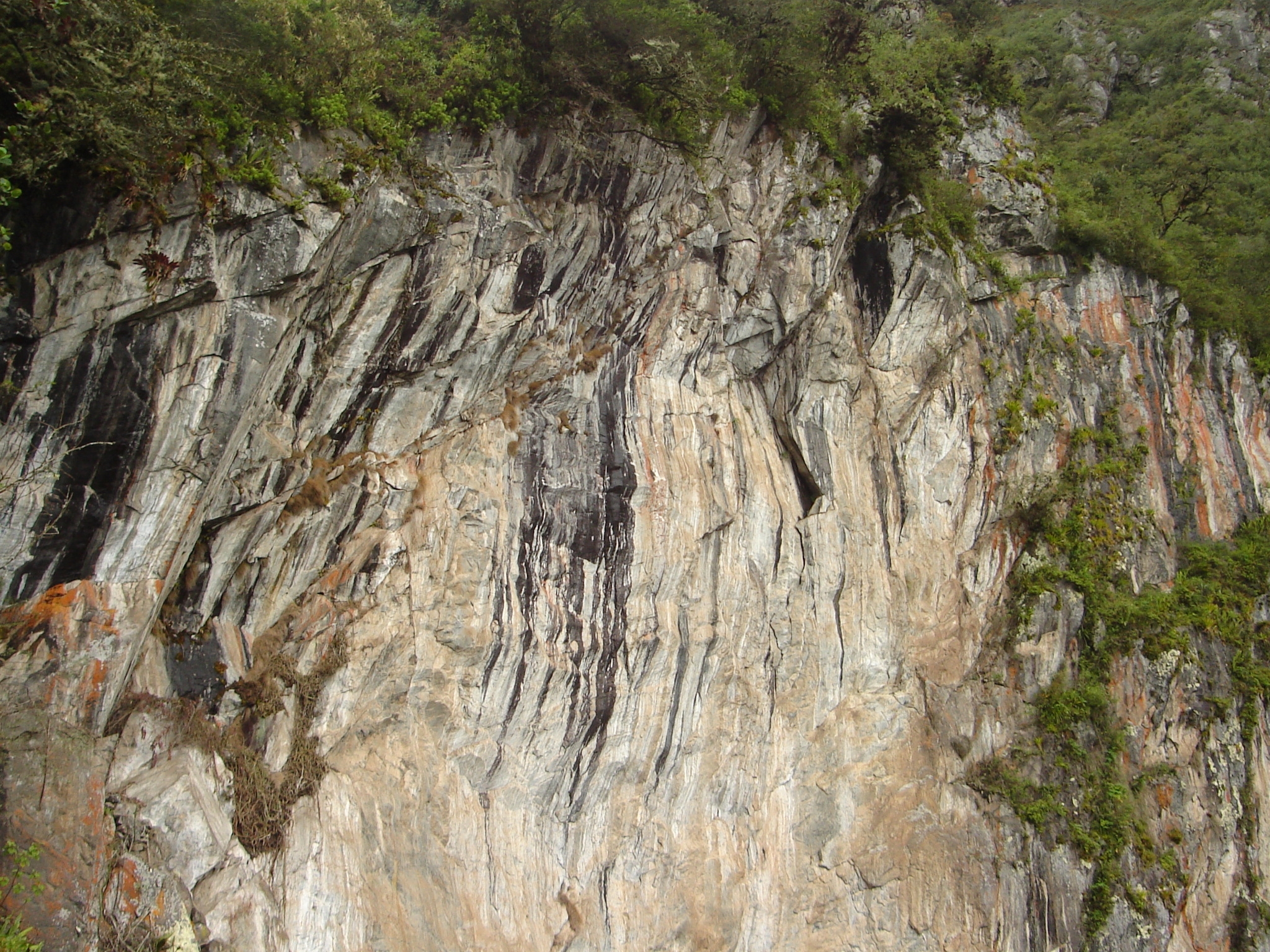 So we head for another hike, to the Inca Bridge. The trail leads from one end of Machu Picchu, goes through the jungle for a few hundred yards, then emerges looking out over a huge near-vertical cliff made of rock encrusted with jungle plants, a couple thousand feet high.