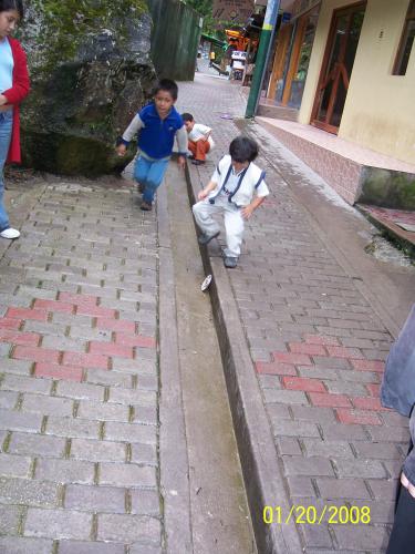 Robin is taken with a group of children rolling CDs down a channel in the middle of the street.