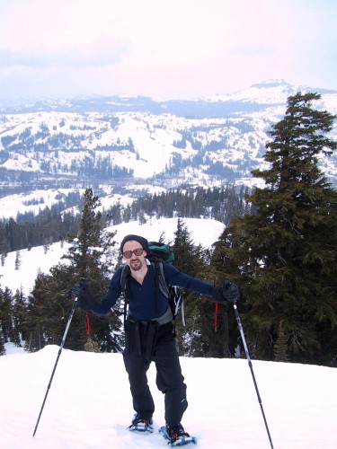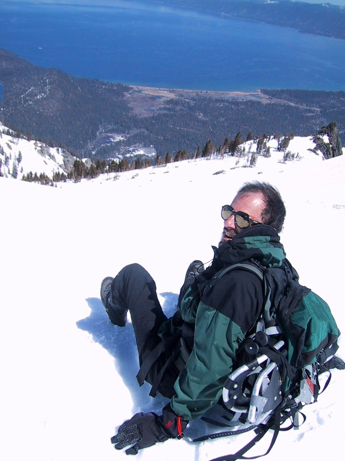 Dave Gedye and I had registered for a winter mountaineering seminar to be held at Mt. Lassen, but it was called off because no one else signed up. Dave had already bought plane tickets from Seattle, so we decided to head for the Sierras instead. On the web, I found a Sierra Club snowshoe climb of Pyramid Peak, in Desolation Wilderness near Lake Tahoe.