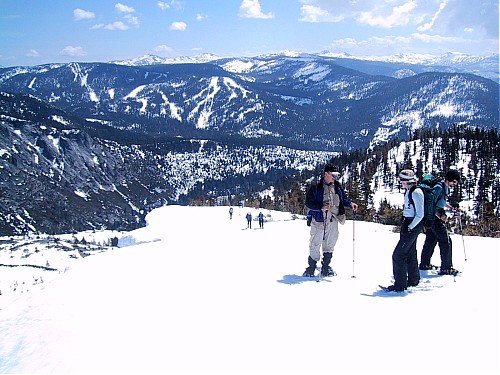 We get up early, a bit hung over, rent snowshoes, and head west, driving around Donner Lake and up to the pass where the Pacific Crest Trail crosses the road (7,090'). Of course we have forgotten to fill our water bottles, so Dave wanders into a nearby structure where, in a surrealistic tableau, a dozen people sitting around a table totally ignore him. Turns out it's a boarding school for young ski racers, and they're taking an SAT test. A proctor tells us to fill our bottles and get out.