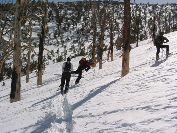 S.P. teaches us the uphill and downhill kick-turns, and we zig-zig our way up the hill. It's fairly hard work, and it doesn't help the my skins are somewhat ineffective and I slip a lot.