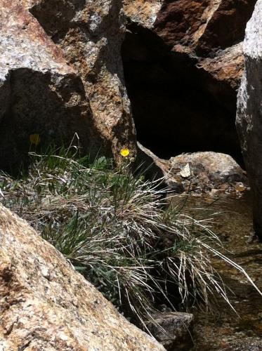 The trail forks a lot and is generally hard to follow. After a few wrong turns, we reach the base of the rocky slope to the left of the falls, which are actually more like cascades. In spite of low Sierra snow-pack, there's a lot of water in the river, and the falls are loud and boisterous.