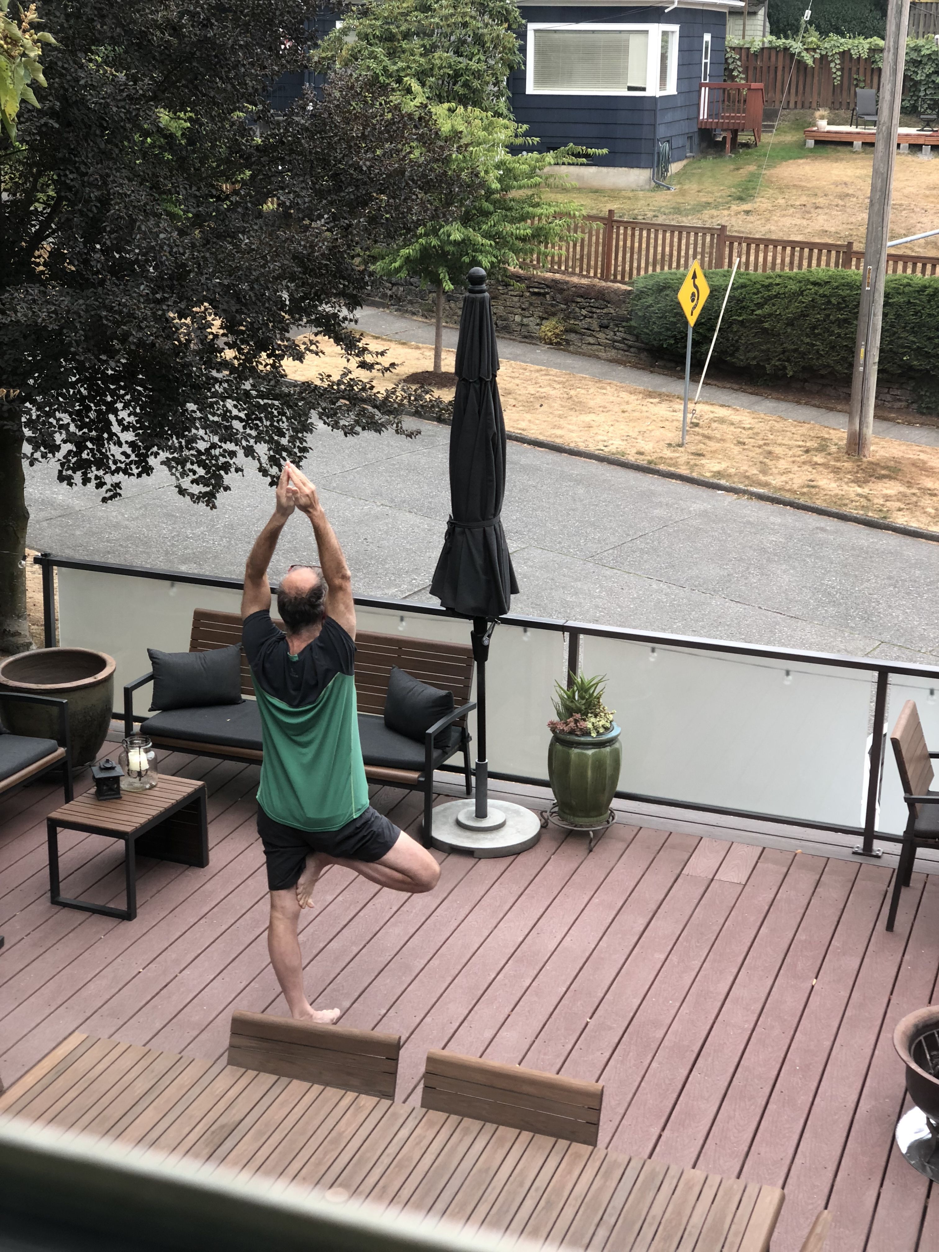 Dave has a "wobble board" which is challenging even with 2 feet. Ron gets the hang of it quickly, and manages to stand on it on one foot, and then do warrior 3 (well, almost).