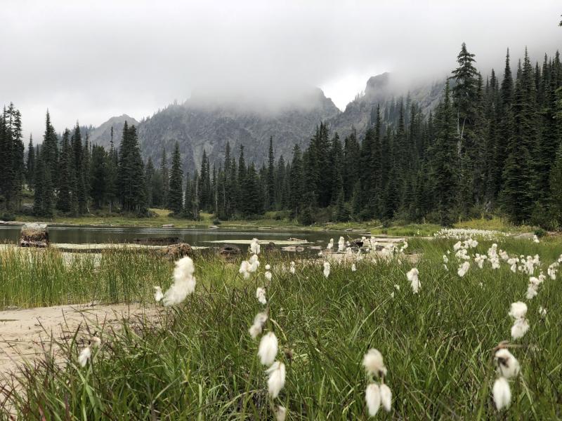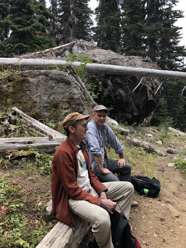 There's a steady drizzle, but beyond Snoqualmie Pass it more or less stops. We discuss various math problems, including the Putnam problem with random points on a circle or sphere. We turn off I-90 and are on the trail at 9:15.