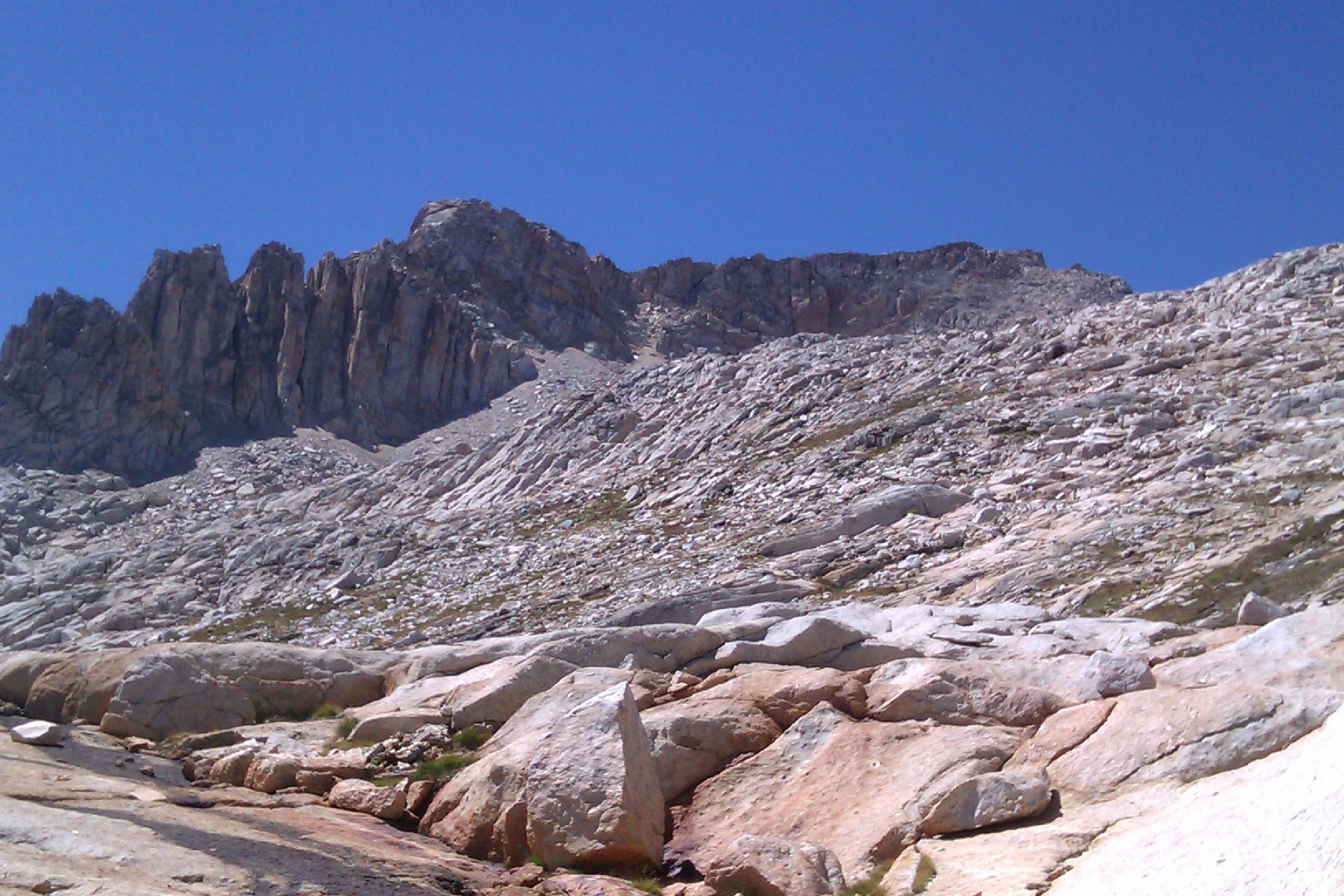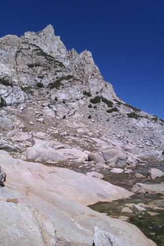 The grass gives out and we scramble across large boulders, coming out at the mini-lake below the ridge. It's 1:00. Our nominal turnaround time is 2:00, but the summit is more than an hour away, and I'm getting tired, so I give an executive order for turnaround. Noah agrees, thought an hour later he's regretting not summiting, and in fact gets pretty whiny about it.