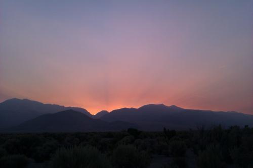 We share the fried chicken dinner at Nicely's, then drive into the desert to visit the campsite (actually just a clearing in the sagebrush) that we pioneered on our trip with Tara and family. Oddly, someone has put a row of dead branches to block it off. I remove these. We get out the camp chairs, and watch the sun go down and the stars come out. We elect not to make a sagebrush fire, due to the possibility of starting a wildfire.