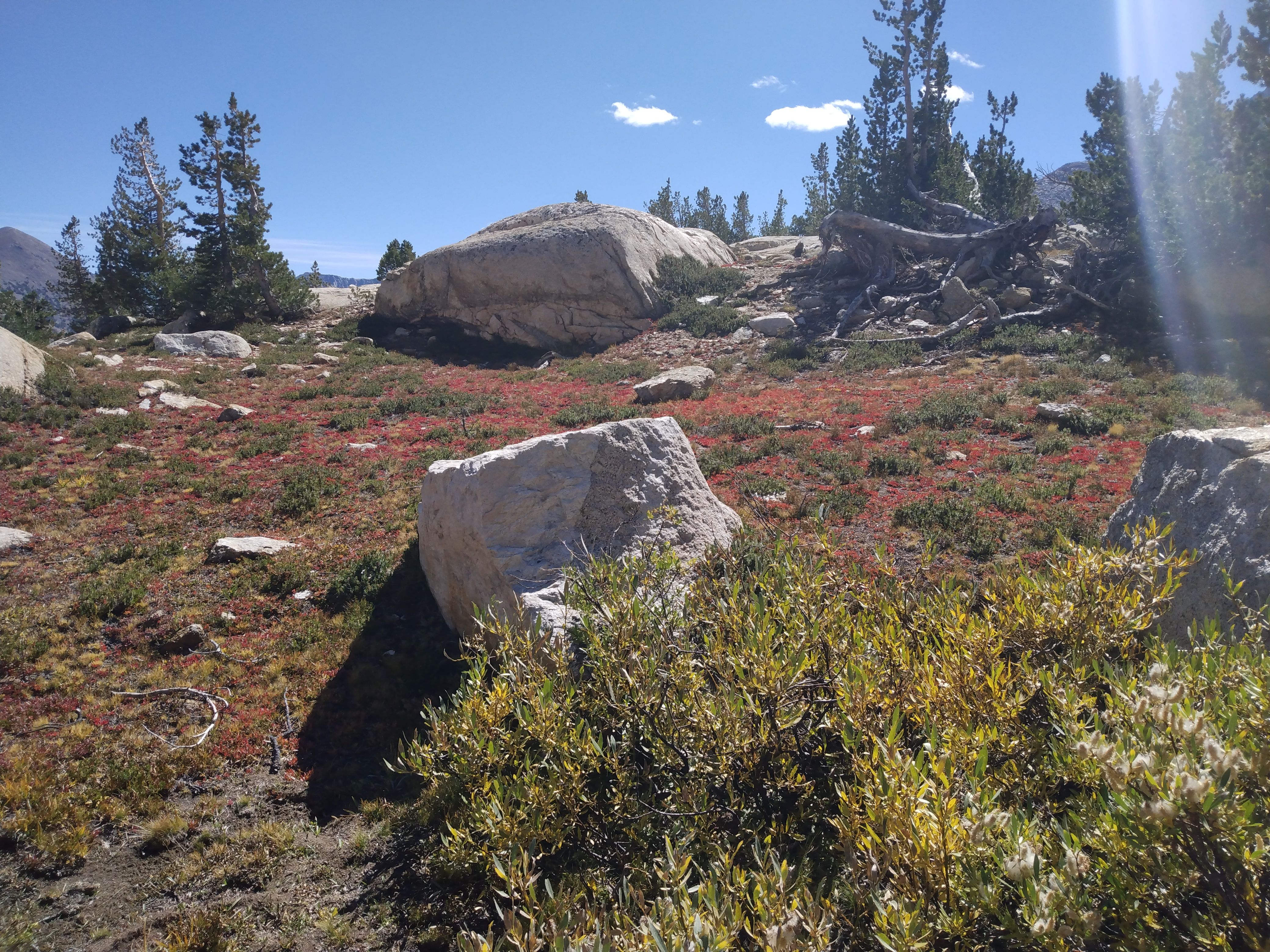 I sleep fairly well, having taken a different sleeping pill. We eat leftovers from yesterday's breakfast. We drive up to Saddlebag Lake, thinking of walking around it and then up to the glacial lakes. In fact a group of senior hikers is about to do just this. But the hike looks butt ugly - the shores of the lake are barren, the lake is low, no vegetation of any sort. So we head down to the Sawmill campground and take the trail toward Mt. Conness.