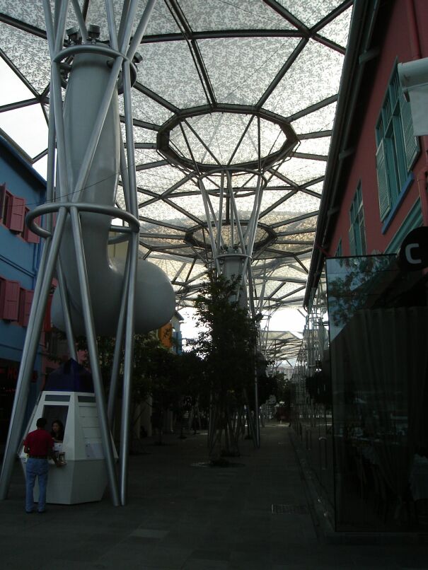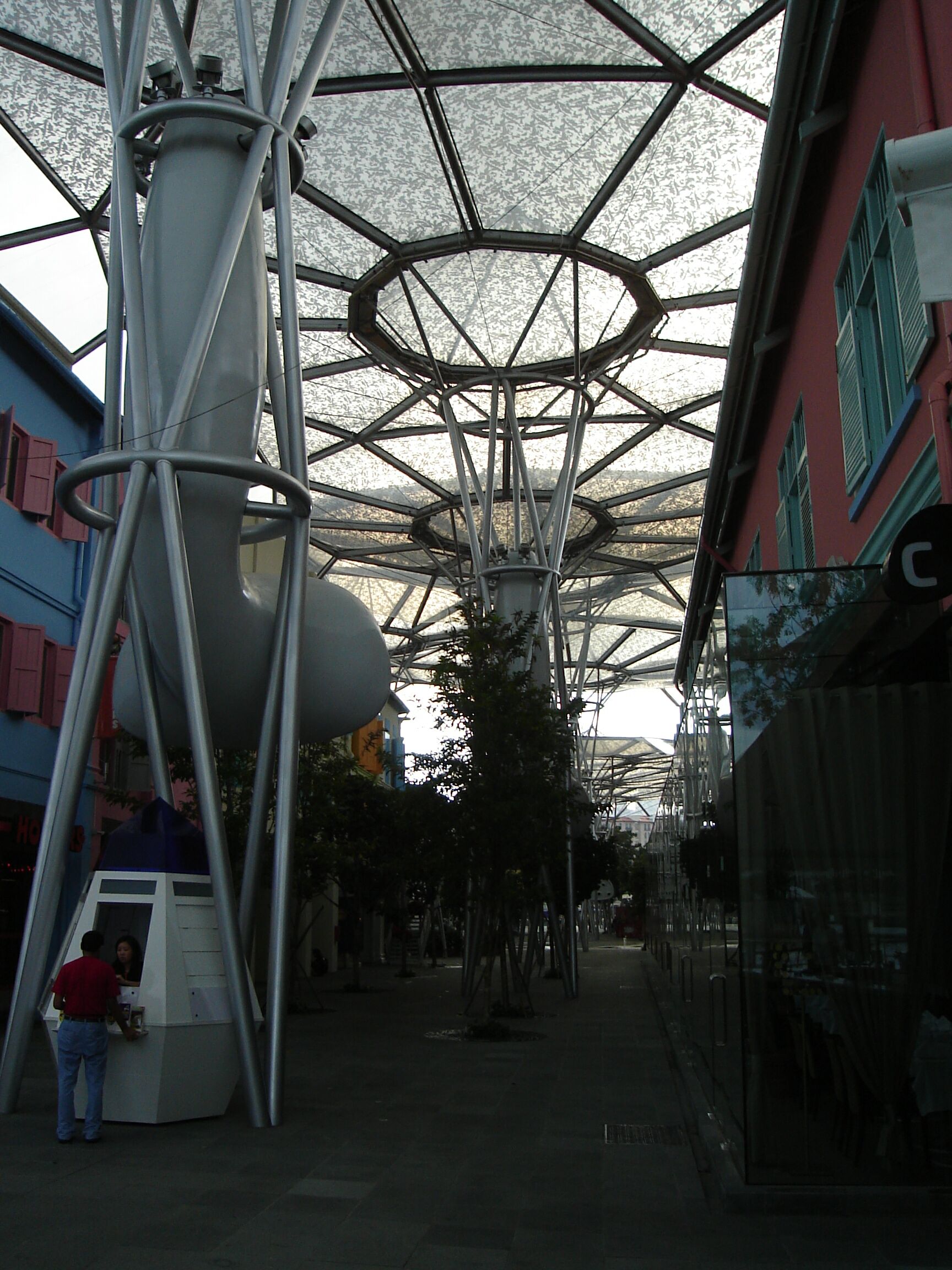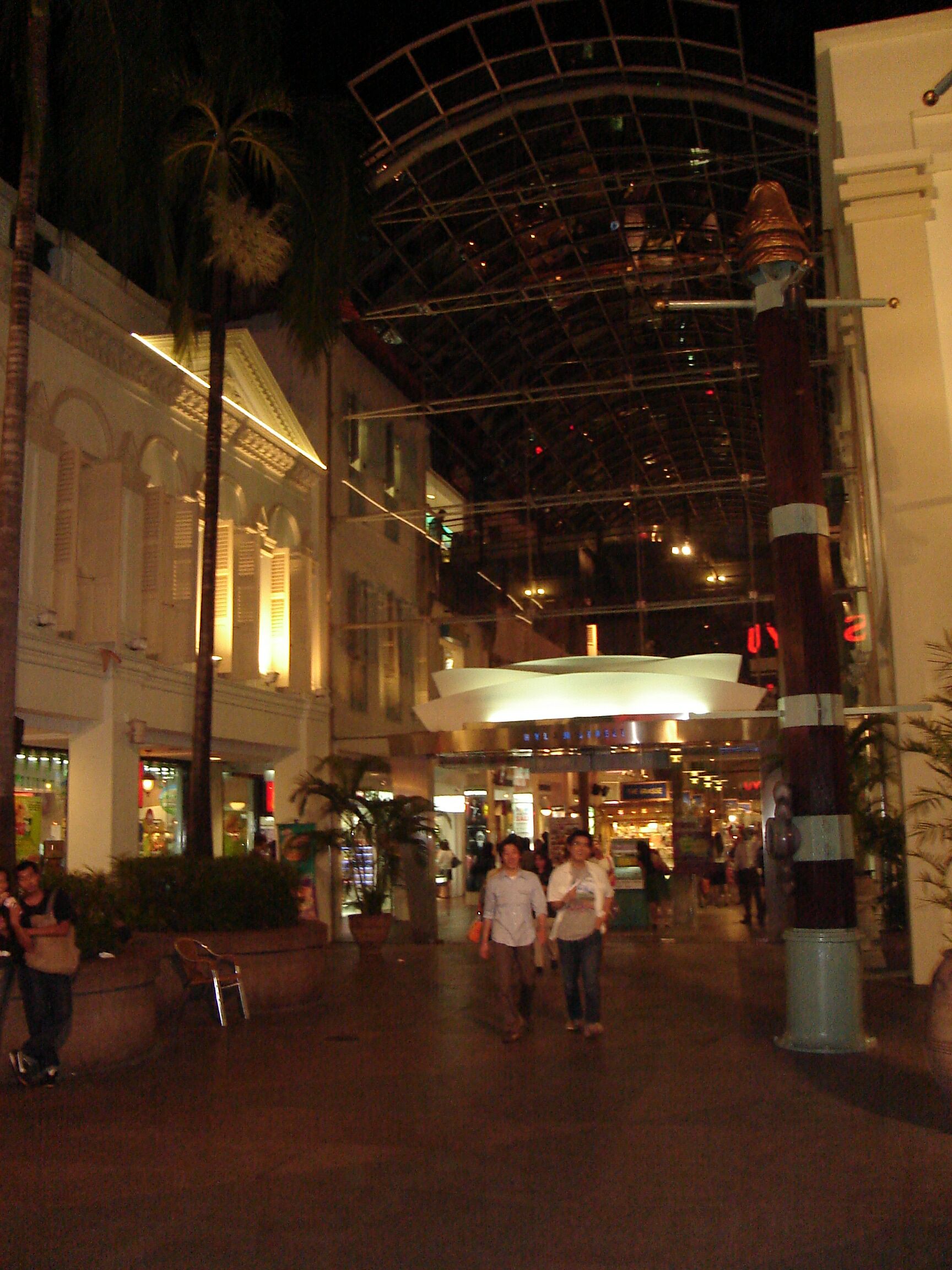 Some towns (like Adelaide) have a big central upscale mall, all air-conditioned and polished granite. In Singapore, there's such a mall every few blocks, each one more lavish than the last. Each mall has a food court, but there are also many open food courts on the street, and a number of gigantic covered open-air mega food courts, with hundreds of grimy stalls. The streets and the malls are aswarm with people late into the night.
