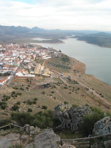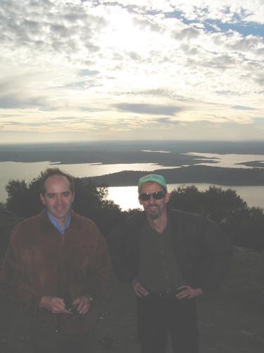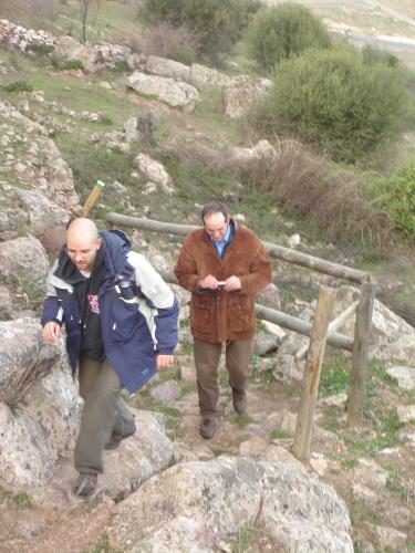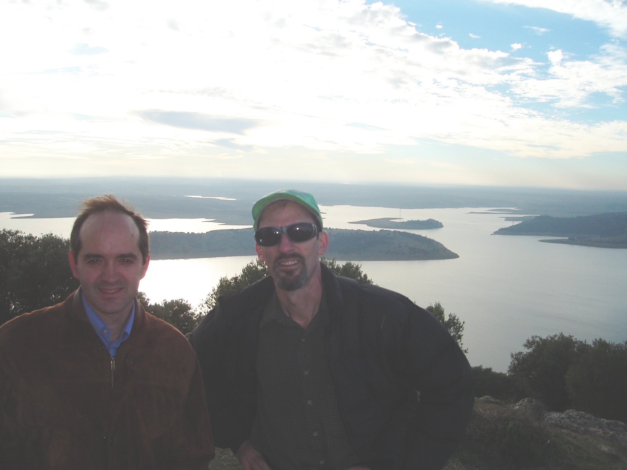 We drive to Alanges, a group of steep rocky hills near the head of a gigantic reservoir. There is rock climbing here, but we don't see any climbers. We drive around to the far side of the hill, where there's a small village (Alanges) and a path leading up to some medieval castle ruins on the hilltop. Of course I go off the trail and clamber up some rocks, and Paco and Daniel follow for a little but then decide I'm crazy and return to the trail.
