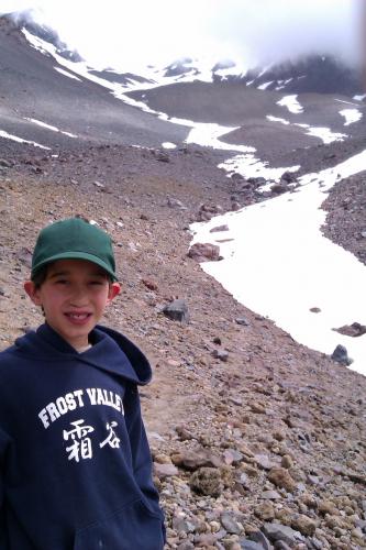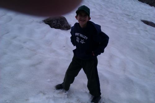 Noah wants to continue. We go up the summit trail on Olbermann's Causeway, past the treeline, up a long, steep, rocky slope, and to 50-50 Flats, where we chat with some campers. There were thunderstorms last night. They look shell-shocked; none of them came close to summiting. We visit some snow in a nearby gully. Noah collects rocks; there are many colors of volcanic rock. We eat Fig Newtons.