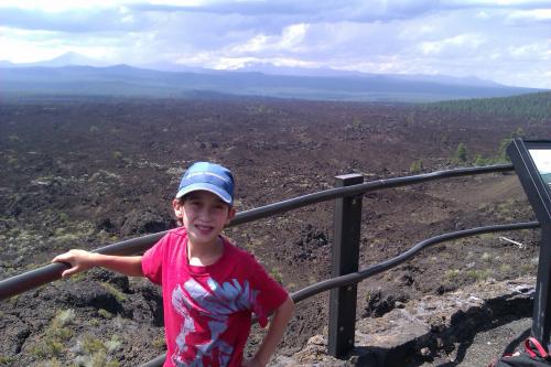 Noah and I drive to a nearby cinder cone, Lava Butte. I expect to be able to pull off the road and bushwhack up this, but it turns out it's some kind of state park, and the only way to walk up is on a long paved road.