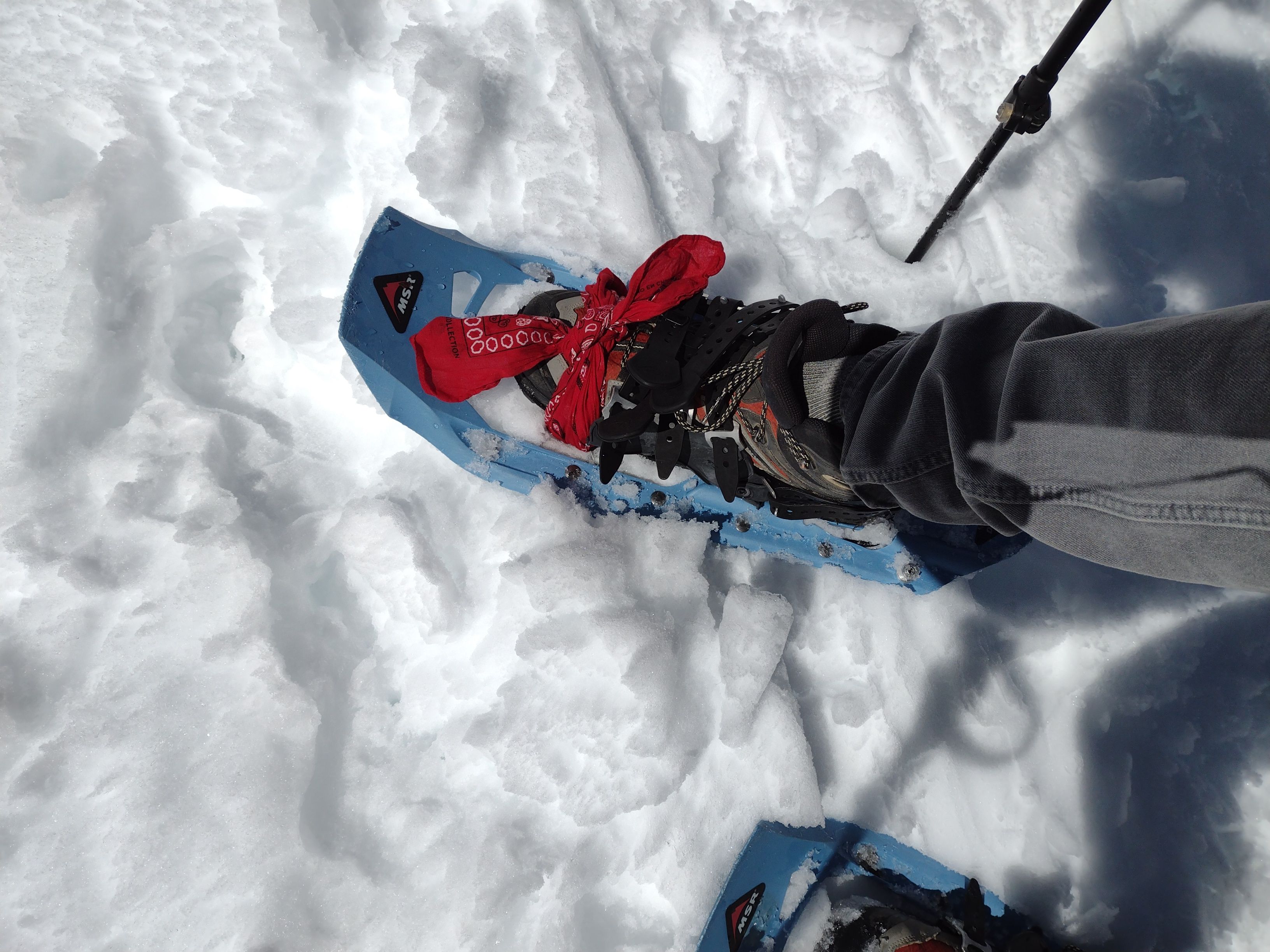 About a mile in, my right snowshoe is suddenly flopping around. The piece of thick plastic that attaches the footbed to the straps has torn, for no particular reason other than that plastic becomes brittle after 20 years. I use a bandana to strap the toe of my boot to the footbed. This works surprisingly well, and we continue.