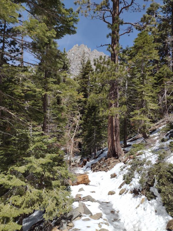 We take a break on a flat area of sun-warmed granite. An older but very athletic guy with white hair is sitting there; his pack has ice axe and crampons. I chat with him a while. He's about to leave the trail and head up a very steep ridge of mixed rock and snow, to a peak looming about 800' over the valley. I wish him luck; he says he's very good at finding safe routes.