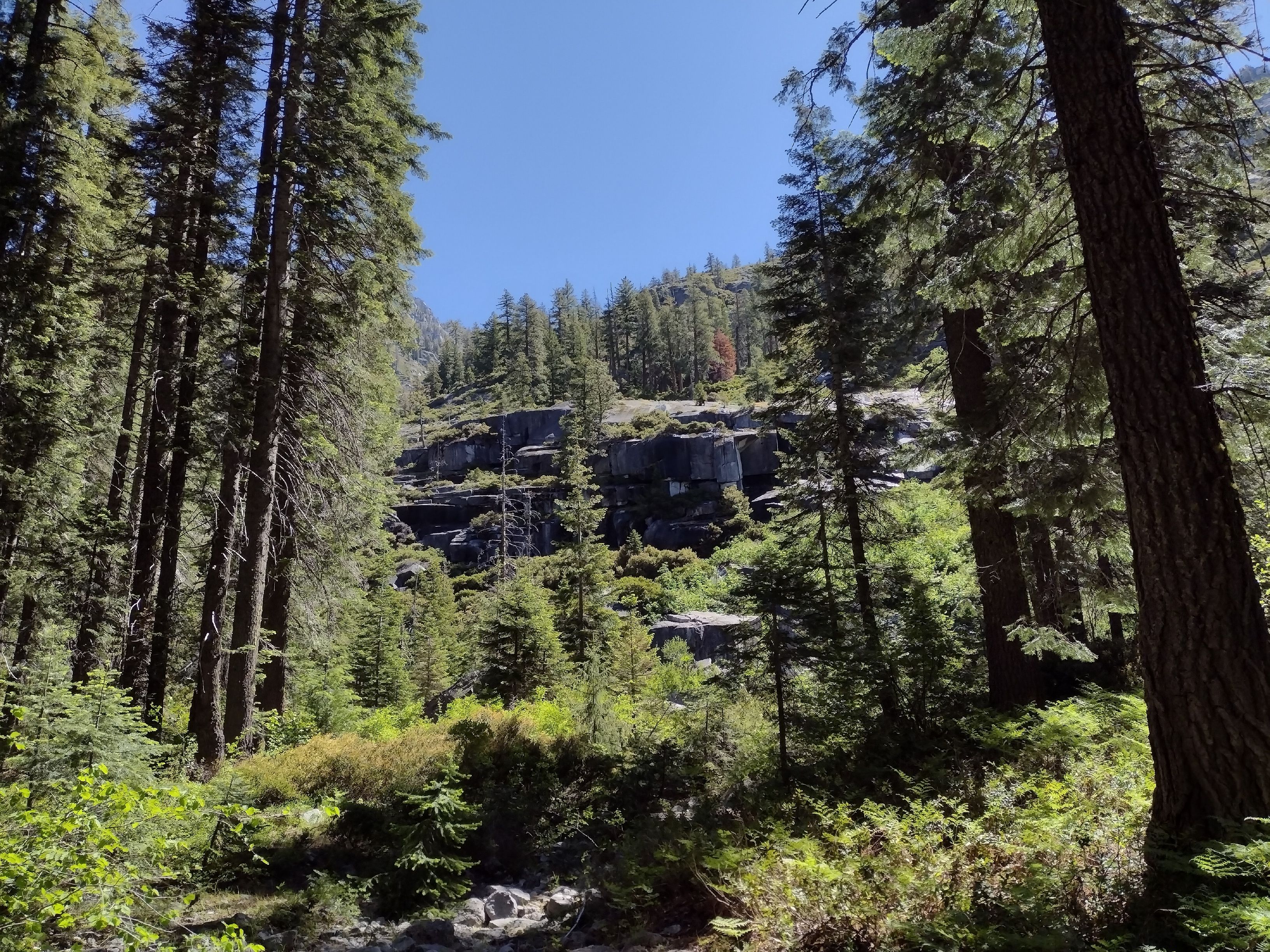 The forecast is for 97 deg, so we get up early (5:30), drive an hour to the trailhead for Canyon Creek Lakes, and are on the trail at 7:40. It's nice and cool. The hike is spectacular, going up a long canyon, through many different varieties of forest. After 8.6 miles and 3000' vertical we arrive at the first lake and have lunch (steak sandwiches). Ron and Dave continue another .5 mile or so to the second lake; I elect to rest.