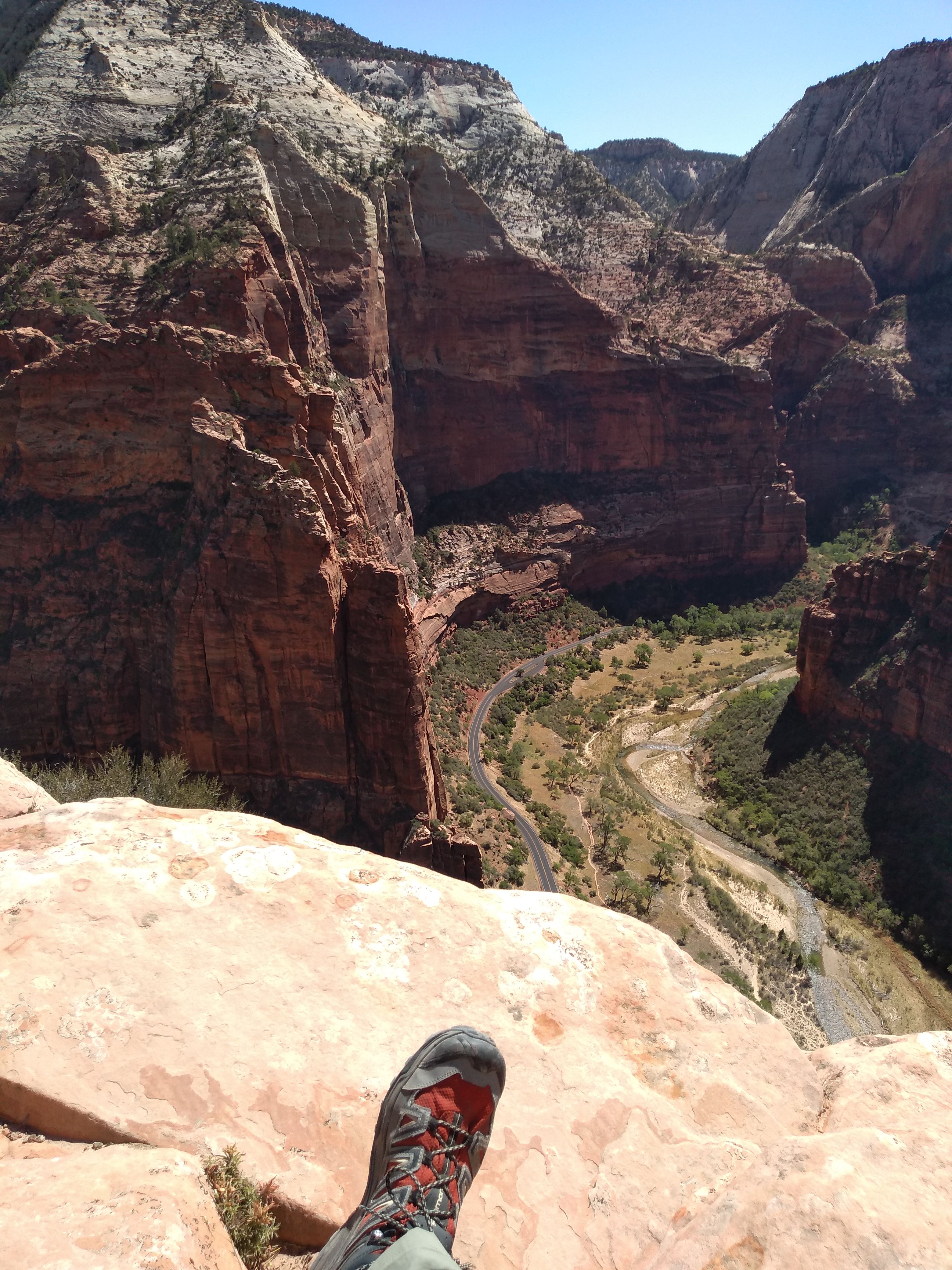 Another bad sleep night (i.e. no deep sleep). We drive to Zion Guru and catch the St. George shuttle. We get off at The Grotto and do the Angel's Landing hike. My back is stiff; K gets a touch of asthma and then uses her inhaler. K is a bit intimidated by the narrow chain sections; as usual I'm irritated by the slow-pokes, and I climb around them. It's crowded but not too bad. At the top, a newlywed couple dons their wedding clothes for pictures. I chat with a guy who did a 120-mile bike ride yesterday.