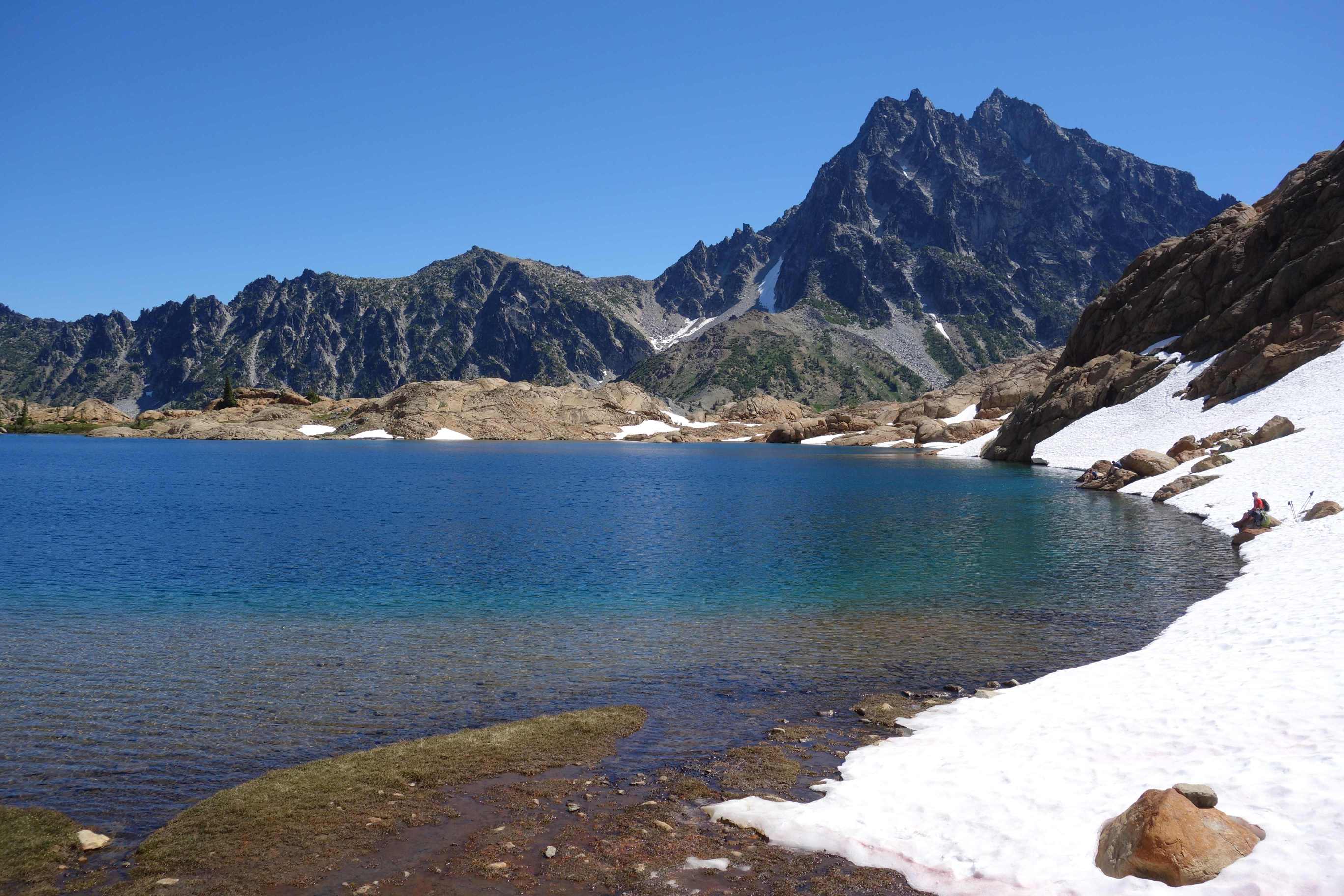 We pass a family of mountain goats, which we treat cautiously since there have been some goring incidents. The trail tops out at a ridge with some campsites. The ultra-steep, evil-looking Mt. Stuart comes into view, only a couple of miles away.
