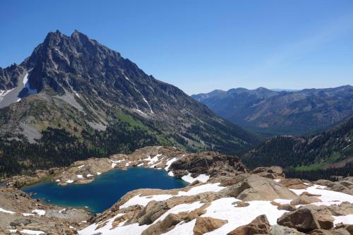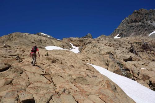 Mt. Ingalls looms another 1,500' or so above the lake. Actually there are two peaks: the main one and the slightly lower south summit. Dave's guide book suggests that it's a straightforward scramble to the latter, but it's not actually easy at all. There are large areas of smooth, easy-to-climb red rock, but there are also areas of scree and, at this time of year, steep snow fields that we're not equipped to climb.