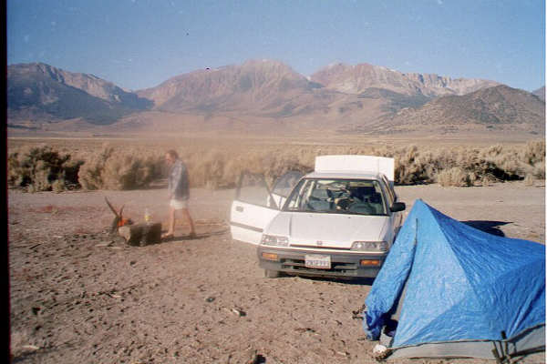 I realized that I had forgotten to pack my walking shorts, and we began a tour of the businesses of Bishop, Big Pine, and Lone Pine. Hard to believe, but except for some shiny nylon basketball shorts in the Bishop K-Mart, there was nothing. Rural people, Lynne points out, are loathe to bare limbs. I was mentally preparing to do the hike in my underwear (it would have been a first, perhaps) but fortunately Mike had an extra pair, and we both have a 32' waist.