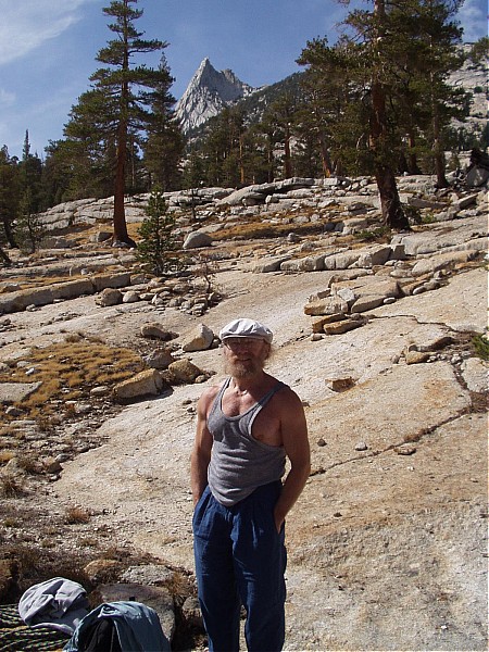 | Dave Altman and I drive up to Groveland on Wednesday night and stay in the funky but expensive Groveland Motel, where most of the rooms are RVs, mobile homes, and teepees. It's only 10:30, but all the bars and liquor stores are closed. The next day we drive into Tuolomne Meadows to climb Cathedral Peak (10,991') by its south face. Not to make excuses, but I'm getting over a cold; I'm weak and congested, have a crinkling-cellophane sound in my left ear, and have migraine-like visual problems. We walk around the left side of Fairview Dome. Dave Altman, with Cathedral Peak in the background; we climbed up the left skyline We went up the left side, left of the obvious chimney. We start climbing around 1:00. As we near the start of the climb it starts to cool off and the wind picks up. After the first pitch Dave's fingers are numb, and it takes him a while to climb the second pitch. I start to get cold. By the middle of the climb I'm freezing, shivering in all muscles, breathing violently to generate heat. At least I have a pair of insulated gloves. We reach the summit around 5:30. We waste no time starting down, traversing to the saddle with Eichorn's Pinnacle, walking in our climbing shoes down steep slabs for several hundred vertical feet, doing some traversing to avoid steep cliffs. Eichorn's Pinnacle, a feature just below the summit. There's a fantastic sunset over the Cathedral Lakes. We hurry to reach the main trail before it's dark. It's deep twilight by the time reach the trail, and we still have 5 miles to the car. I've neglected to bring my headlamp, so I have to zigzag in front of Dave. Not an full-fledged epic, but getting there. Fortunately the liquor store is still open when we get back to Groveland.