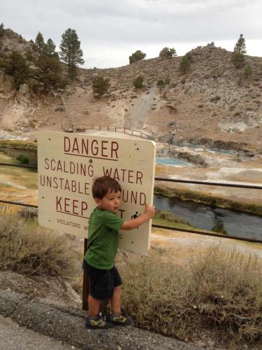At 4:45 we decide to do one more adventure, namely Hot Creek. This triggers a small tantrum from Noah, who wants to return to camp, but Tara mollifies him with the offer of a movie on her iPad. Noah accepts, but it quickly makes him car-sick.